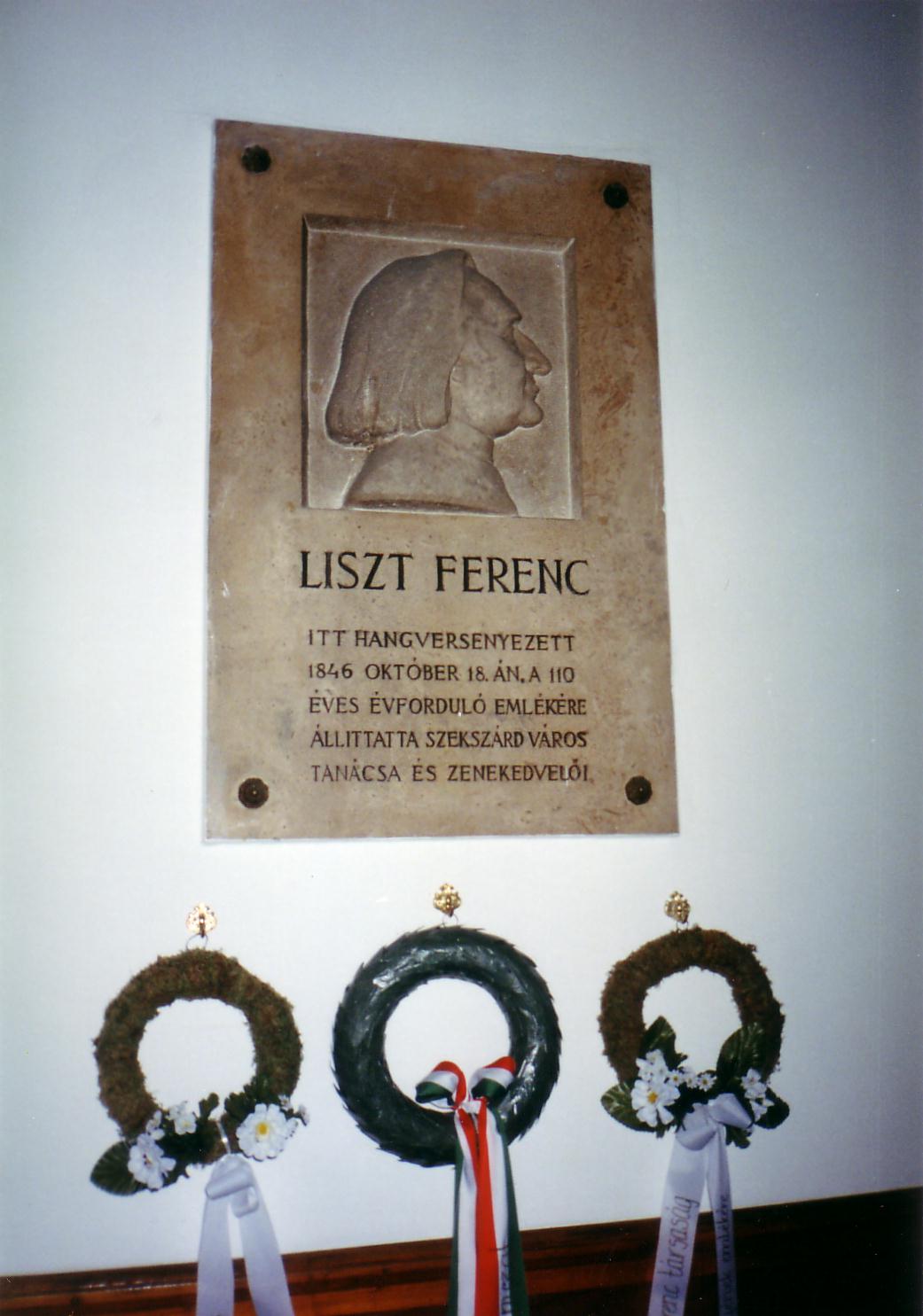 Nyilvános 1523 | 3504 | Szekszárd, Béla tér 1. Megyeháza | Az 1799-ben megyeszékhellyé vált Szekszárd közigazgatási központját, a Megyeházát 1828–1833 között építették Pollack Mihály tervei szerint klaszicista stílusban. Annakidején a megyeháza kulturális feladatokat is teljesített: ma is meglévő nagy tanácstermében úri bálokat, műkedvelő előadásokat és — ritkábban — hangversenyeket rendeztek. A hangversenyek közül kiemelkedik Liszt Ferenc 1846. október 18-i fellépése. Liszt Ferencet szoros barátság fűzte Augusz Antal szekszárdi földbirtokoshoz, akinek otthonában (lásd: Szekszárd, Széchenyi u. 36-38.) többször is vendégeskedett. A nagyteremben, ahol Liszt játszott, 1956-ban avatták fel emléktábláját. Sajnos, a Wigand Edit által készített portrédombormű Lisztet jóval idősebb korában ábrázolja; a valóságban koncertje után pár nappal lett 35 éves. A Megyeházán tekinthető meg a Wosinszky Mór Múzeum állandó Liszt Ferenc emlékkiállítása (lásd a következő képeket). A fénykép 1999 júliusában készült. Felh. irod.: Vendel–Mohay Lajosné: Liszt–emlékek Szekszárdon. Szekszárd, 1986 Hamburger Klára: Liszt Ferenc és Szekszárd. = Dunatáj 1986. 3. Husek Rezső: Liszt–kultusz Szekszárdon. = Dunatáj 1986. 3. |