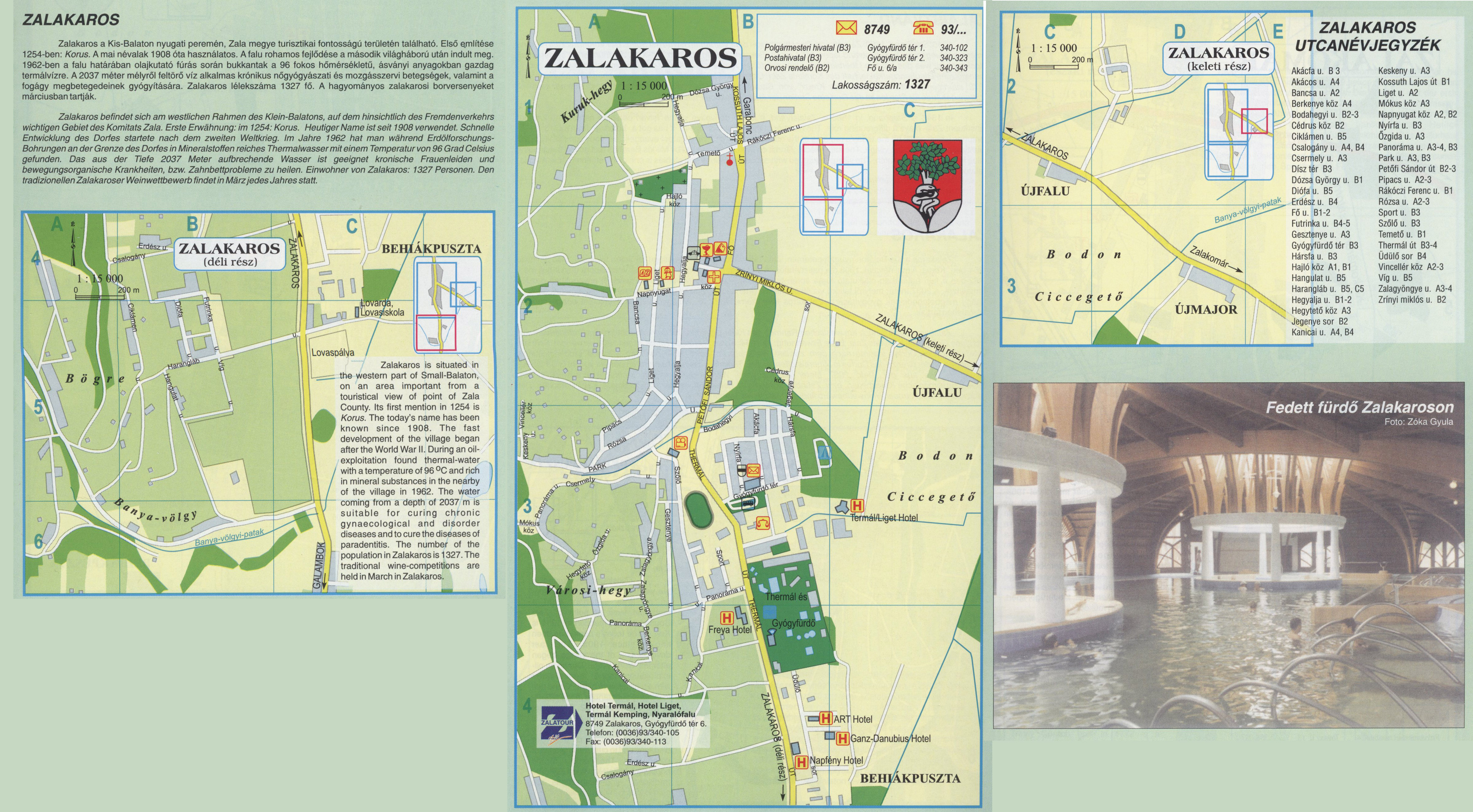 Nyilvános 1987 | 6432 | ZALAKAROS | Zalakaros a Kis-Balaton nyugati peremén, Zala megye turisztikai fontosságú területén található. Első említése 1254-ben: Korus. A mai névalak 1908 óta használatos. A falu rohamos fejlődése a második világháború után indult meg. 1962-ben a falu határában olajkutató fúrás során bukkantak a 96 fokos hőmérsékletű, ásványi anyagokban gazdag termálvízre. A 2037 méter mélyről feltörő víz alkalmas krónikus nőgyógyászati és mozgásszervi betegségek, valamint a fogágy megbetegedéseinek gyógyítására. Zalakaros lélekszáma 1327 fő. A hagyományos zalakarosi borversenyeket márciusban tartják. Zalakaros befindet sich am westlichen Rahmen des Klein-Balatons, auf dem hinsichtlich des Fremdenverkehrs wichtigen Gebiet des Komitats Zala. Erste Erwähnung: im 1254: Korus. Heutiger Name ist seit 1908 verwendet. Schnelle Entwicklung des Dorfes startete nach dem zweiten Weltkrieg. Im Jahre 1962 hat man während Erdölforschungs-Bohrungen an der Grenze des Dorfes in Mineralstoffen reiches Thermalwasser mit einem Temperatur von 96 Grad Celsius gefunden. Das aus der Tiefe 2037 Meter aufbrechende Wasser ist geeignet kronische Frauenleiden und bewegungsorganische Krankheiten, bzw. Zahnbettprobleme zu heilen. Einwohner von Zalakaros: 1327 Personen. Den tradizionellen Zalakaroser Weinwettbewerb findet in März jedes Jahres statt. Zalakaros is situated in the western part of Small-Balaton, on an area important from a touristical view of point of Zala County. Its first mention in 1254 is Korus. The today\'s name has been known since 1908. The fast development of the village began after the World War II. During an oil-exploitation found thermal-water with a temperature of 96 °C and rich in mineral substances in the nearby of the village in 1962. The water coming from a depth of 2037 m is suitable for curing chronic gynaecological and disorder diseases and to cure the diseases of paradentitis. The number of the population in Zalakaros is 1327. The traditional wine-competitions are held in March in Zalakaros. A részlet a következő kiadványból származik/Die Teile stammen vom volgenden Buch/This text came from the following book: Cím/Titel/Title: Zala megye településeinek atlasza - 257 település részletes térképe/Atlas der Komitat Zala - 257 Detailte Siedlungskarten/Zala county\'s Atlas - 257 settlement maps. Közreműködő/contributor: Lackner László (1943) (fotó) Kiadás/Ausgabe/Publisher: Gyula : HISZI-MAP, 1997 Sorozat/Serie/Series: Indulástól - megérkezésig... ETO: 912(439.121-2) ; 908.439.121 Cutter: Z 19 ISBN: 963-610-025-4 Oldalszám/Seiten/Pages: 323, 81 p. Megjegyzés/Note: Lezárva/Abgeschlossen am/Closed am: 1997. máj. 30. |