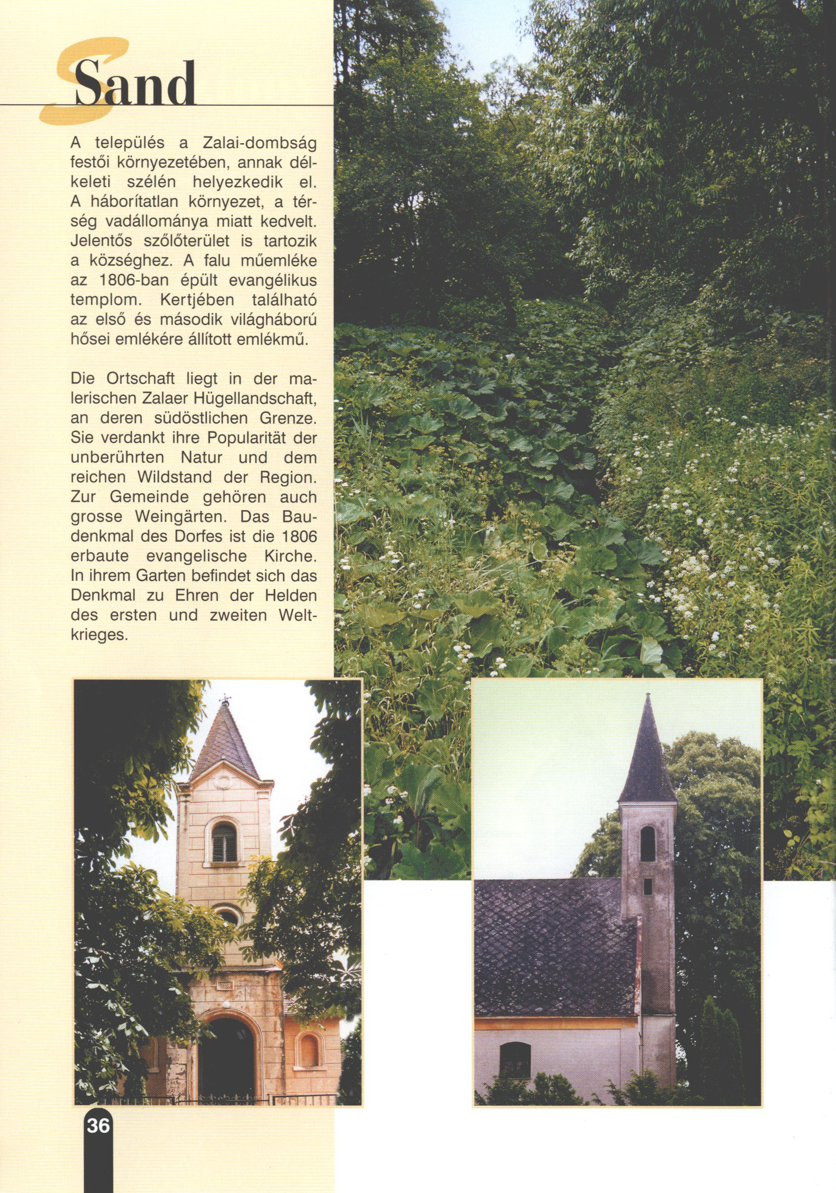 Nyilvános 2547 | 7731 | Sand | Die Ortschaft liegt in der malerischen Zaiaer Hügellandschaft, an deren südöstlichen Grenze. Sie verdankt ihre Popularität der unberührten Natur und dem reichen Wildstand der Region. Zur Gemeinde gehören auch grosse Weingärten. Das Baudenkmal des Dorfes ist die 1806 erbaute evangelische Kirche. In ihrem Garten befindet sich das Denkmal zu Ehren der Helden des ersten und zweiten Weltkrieges. Dieses Text stammt von: Titel: Hívogató a Régiók Kapujában - Útikönyv Látnivalók Nagykanizsán és Térségében (Einladend in dem Tor des Gebiets - Reisebuch - Sehenswürdigkeiten in Nagykanizsa und Umgebung) Herausgegeben von: Nagykanizsa és a Környező Települések Területfejlesztési Társulása (Verein für Gebietsentwicklung in Nagykanizsa und in ihrer Umgebung) 8800 Nagykanizsa, Petőfi Sándor út 5. Tel.: 06 93/536-453 • 06 93/536-454 Tel ./Fax: 06 93/326-323 E-mail: terstars@axelero.hu www.kanizsaterseg.celodin.hu |