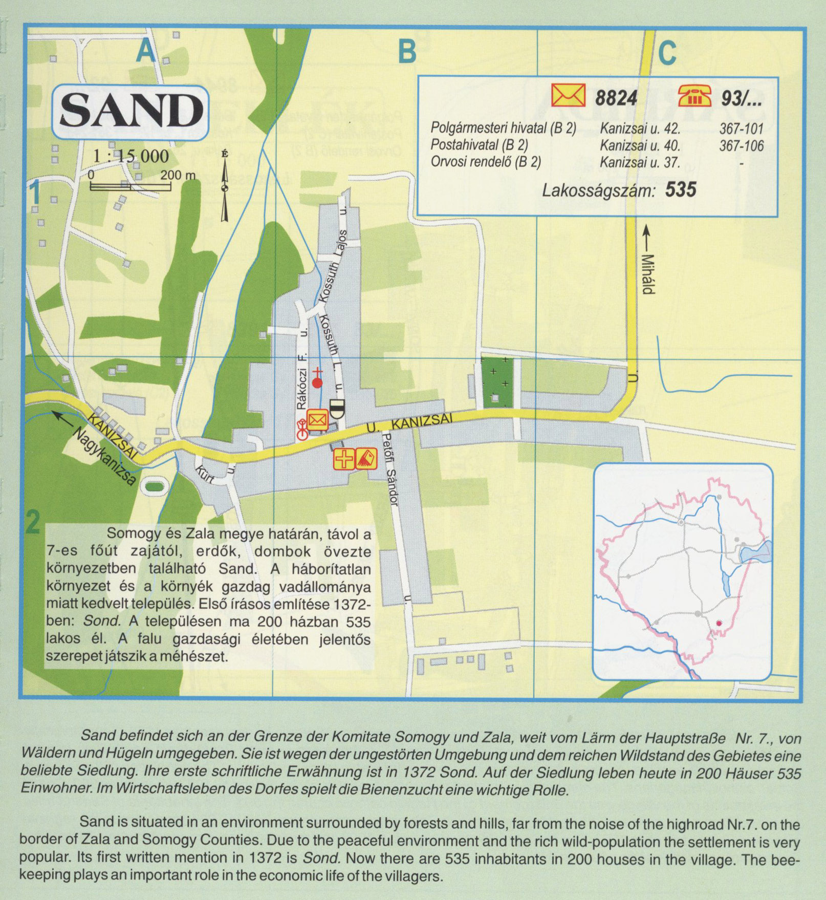 Nyilvános 2539 | 9474 | Sand | Somogy és Zala megye határán, távol a 7-es főút zajától, erdők, dombok övezte környezetben található Sand. A háborítatlan környezet és a környék gazdag vadállománya miatt kedvelt település. Első írásos említése 1372-ben: Sond. A településen ma 200 házban 535 lakos él. A falu gazdasági életében jelentős szerepet játszik a méhészet. Sand befindet sich an der Grenze der Komitate Somogy und Zala, weit vom Lärm der Hauptstraße Nr. 7., von Wäldern und Hügeln umgegeben. Sie ist wegen der ungestörten Umgebung und dem reichen Wildstand des Gebietes eine beliebte Siedlung. Ihre erste schriftliche Erwähnung ist in 1372 Sond. Auf der Siedlung leben heute in 200 Häuser 535 Einwohner. Im Wirtschaftsleben des Dorfes spielt die Bienenzucht eine wichtige Rolle. Sand is situated in an environment surrounded by forests and hills, far from the noise of the highroad Nr.7. on the border of Zala and Somogy Counties. Due to the peaceful environment and the rich wild-population the settlement is very popular. Its first written mention in 1372 is Sond. Now there are 535 inhabitants in 200 houses in the village. The bee-keeping plays an important role in the economic life of the villagers. A részlet a következő kiadványból származik/Die Teile stammen vom volgenden Buch/This text came from the following book: Cím/Titel/Title: Zala megye településeinek atlasza - 257 település részletes térképe/Atlas der Komitat Zala - 257 Detailte Siedlungskarten/Zala county\'s Atlas - 257 settlement maps. Közreműködő/contributor: Lackner László (1943) (fotó) Kiadás/Ausgabe/Publisher: Gyula : HISZI-MAP, 1997 Sorozat/Serie/Series: Indulástól - megérkezésig... ETO: 912(439.121-2) ; 908.439.121 Cutter: Z 19 ISBN: 963-610-025-4 Oldalszám/Seiten/Pages: 323, 81 p. Megjegyzés/Note: Lezárva/Abgeschlossen am/Closed am: 1997. máj. 30. |