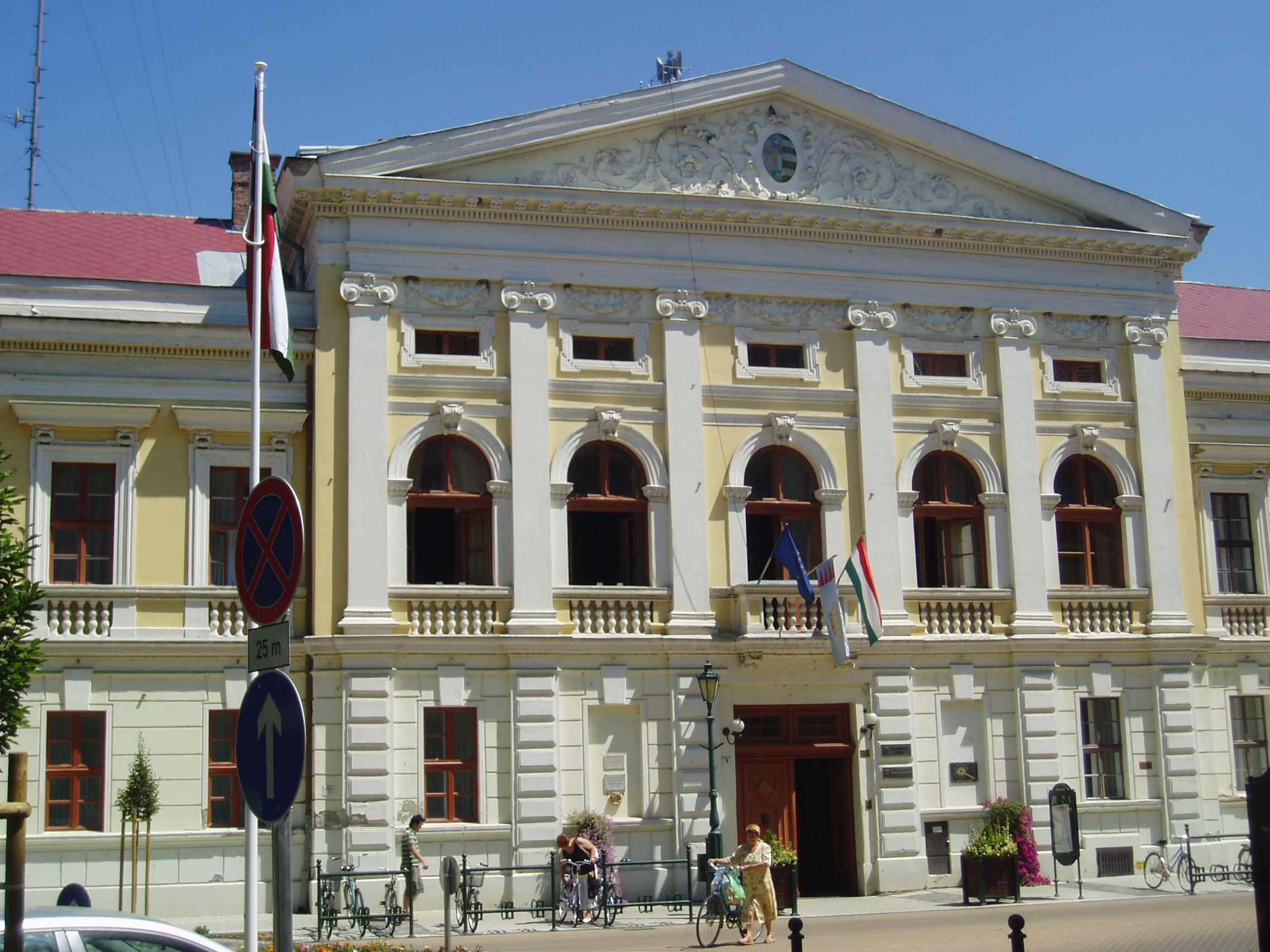 Nyilvános 1075 | 1576 | Gyula, Petőfi tér 3. Régi Vármegyeháza | A városközponti háromszög alakú hangulatos tér csaknem minden épülete történelmi vagy műemléki érték. Az egykori Vármegyeháza - a mai Városháza - a tér legszebb épülete. Eredeti formájában a XVIII. század utolsó harmadában épült az akkoriban újjátelepült Békés megye közigazgatási központjának. Azóta többszöri átépítéseket, alakításokat, bővítéseket hajtottak végre rajta. Ezek eredményeképpen ma barokk, klasszicista, romantikus és eklektikus részleteket egyaránt megfigyelhetünk az összességében eklektikus hatású épületen. A Vármegyeháza sok nevezetes eseménynek volt helyszíne. 1848. március 22-én az udvaron ismertették az egybegyűlt sokaság előtt a Pesten zajló eseményeket. A helyi hagyomány szerint 1849 júliusában a védbizottmány egyik ülésén mondta el utolsó politikai beszédét Petőfi Sándor. A költő akkoriban Mezőberényben tartózkodott, onnan rándult át a megyeszékhelyre. Az eseményt az épület homlokzatán emléktábla örökíti meg. A fénykép 2007 júliusában készült. Felh. irod.: Czeglédi Imre: Gyula útikalauz. 2. jav., bőv. kiad. Gyula, 1995 |