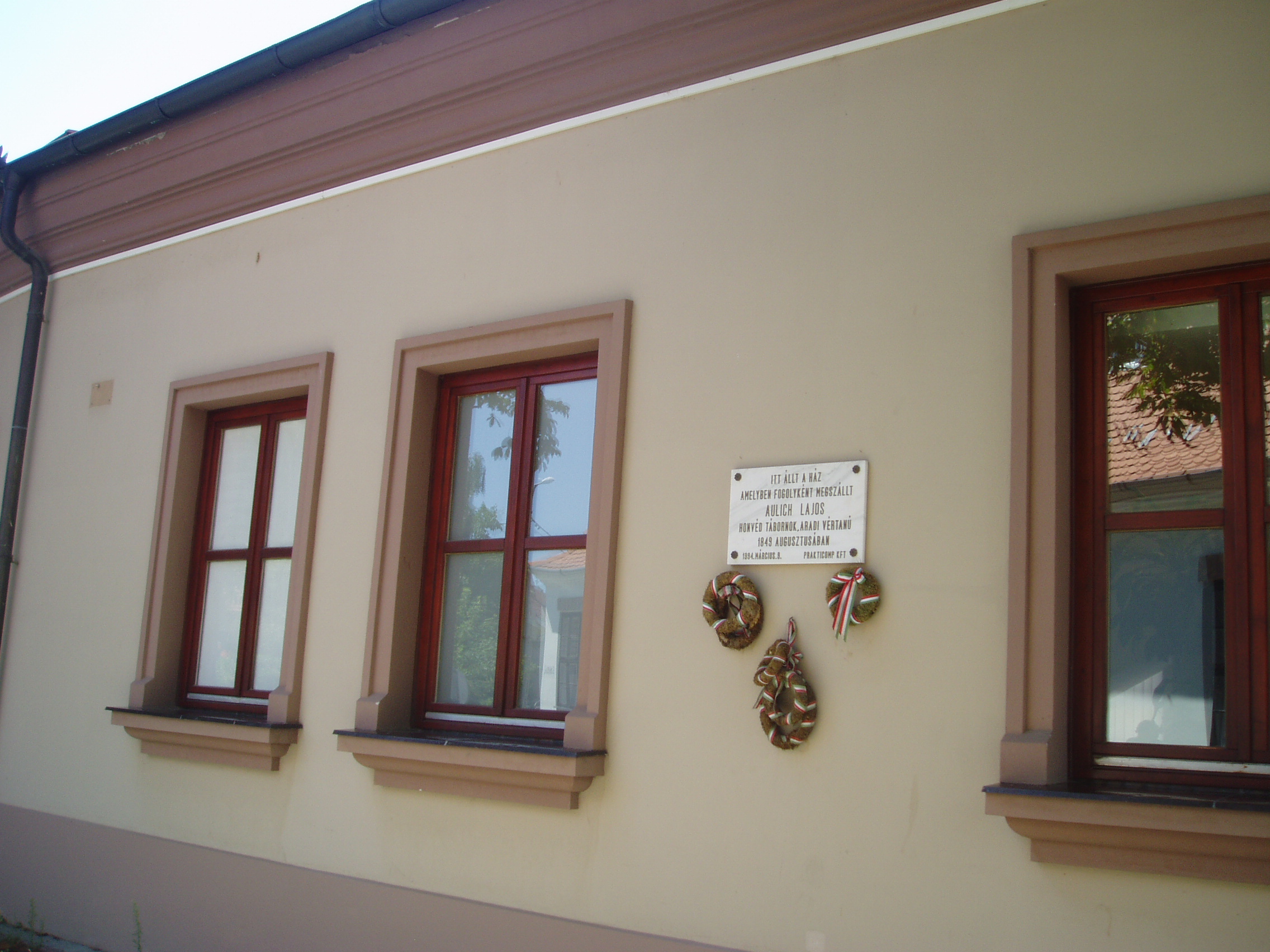 Nyilvános 1109 | 1577 | Gyula, Városház utca 23. | A lakóházat 1994-ben eredeti formájában építették újjá. 1849 augusztusában itt szállt meg Aulich Lajos honvéd tábornok. A szabadságharc tragikus gyulai eseményét lásd: Gyula, Várkert: Honvédtiszti emlékhely. A fénykép 2007 júliusában készült. Felh. irod.: Czeglédi Imre: Gyula útikalauz. 2. jav., bőv. kiad. Gyula, 1995 |