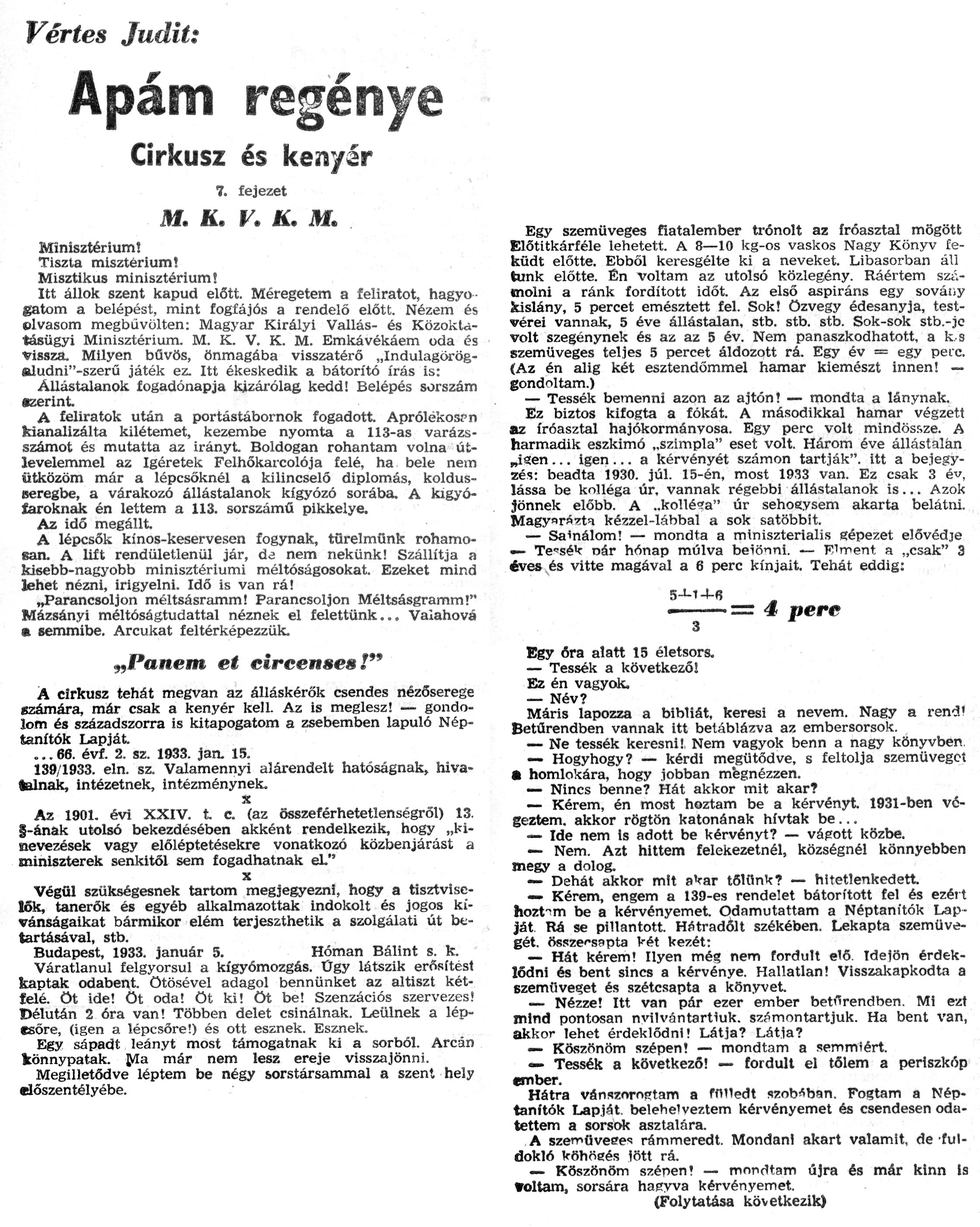 Nyilvános 1423 | 2326 | Zalai Hírlap 1971.02.14. 038sz 08old - Apám regénye 07 | A következő szöveg a cikkből keletkezett automata szövegfelismertető segítségével: Vértes Judit: Apám regénye Cirkusz és kenyér 7. fejezet M. K. V. K. M, Minisztérium! Tiszta misztérium! Misztikus minisztérium! Itt állok szent kapud előtt. Méregetem a feliratot, hagyó-gatom a belépést, mint fogfájós a rendelő előtt. Nézem és olvasom megbüvölten: Magyar Királyi Vallás- és Közoktatásügyi Minisztérium. M. K. V. K. M. Emkávékáem oda és vissza. Milyen bűvös, önmagába visszatérő „Indulagörög-aludni"-szerű játék ez. Itt ékeskedik a bátorító írás is: Állástalanok fogadónapja kizárólag kedd! Belépés sorszám szerint A feliratok után a portástábornok fogadott. Aprólékosan kianalizálta kilétemet, kezembe nyomta a 113-as varázsszámot és mutatta az irányt. Boldogan rohantam volna útlevelemmel az ígéretek Felhőkarcolója felé, ha bele nem ütközöm már a lépcsőknél a kilincselő diplomás, koldusseregbe, a várakozó állástalanok kígyózó sorába. A kigyó-íaroknak én lettem a 113. sorszámú pikkelye. Az idő megállt. A lépcsők kínos-keservesen fogynak, türelmünk rohamosan. A lift rendületlenül jár, da nem nekünk! Szállítja a kisebb-nagyobb minisztériumi méltóságosokat. Ezeket mind lehet nézni, irigyelni. Idő is van rá! „Parancsoljon méltsásramm! Parancsoljon Méltsásgramm!" Mázsányi méltóságtudattal néznek el felettünk... Valahová m semmibe. Arcukat feltérképezzük. „Panem et eircensea!" A cirkusz tehát megvan az álláskérők csendes nézőserege szamára, már csak a kenyér kell. Az is meglesz! — gondolom és századszorra is kitapogatom a zsebemben lapuló Néptanítók Lapját. ... 66. évf. 2. sz. 1933. jan. 15. 139/1933. eln. sz. Valamennyi alárendelt hatóságnak, hivatalnak, intézetnek, intézménynek. X Az 1901. évi XXIV. t c. (az összeférhetetlenségről) 13. §-ának utolsó bekezdésében akként rendelkezik, hogy „kinevezések vagy előléptetésekre vonatkozó közbenjárást a miniszterek senkitől sem fogadhatnak eL" x Végül szükségesnek tartom megjegyezni, hogy a tisztviselők, tanerők és egyéb alkalmazottak indokolt és jogos kívánságaikat bármikor elém terjeszthetik a szolgálati út betartásával, stb. Budapest, 1933. január 5. Hóman Bálint s. k. Váratlanul felgyorsul a kígyómozgás. Ügy látszik erősítést kaptak odabent, ötösével adagol bennünket az altiszt kétfelé. Öt ide! öt oda! Öt ki! öt be! Szenzációs szervezés! Délután 2 óra van! Többen delet csinálnak. Leülnek a léptsőre, (igen a lépcsőre!) és ott esznek. Esznek. Egy sápadt leányt most támogatnak ki a sorból. Arcán könnypatak. Jtfa már nem lesz ereje visszajönni. Megilletődve léptem be négy sorstársammal a szent hely élőszentélyébe. Egy szemüveges fiatalember trónolt az íróasztal mögött Előtitkárféle lehetett. A 8—10 kg-os vaskos Nagy Könyv feküdt előtte. Ebből keresgélte ki a neveket. Libasorban áll tünk előtte. Én voltam az utolsó közlegény. Ráértem számolni a ránk fordított időt. Az első aspiráns egy sovány kislány, 5 percet emésztett fel. Sok! özvegy édesanyja, testvérei vannak, 5 éve állástalan, stb. stb. stb. Sok-sok stb.-jo volt szegénynek és az az 5 év. Nem panaszkodhatott, a k.s szemüveges teljes 5 percet áldozott rá. Egy év = egy perc. (Az én alig két esztendőmmel hamar kiemészt innen! — gondoltam.) — Tessék bemenni azon az ajtón! — mondta a lánynak. Ez biztos kifogta a fókát. A másodikkal hamar végzett az íróasztal hajókormánvosa. Egy perc volt mindössze. A harmadik eszkimó „szimpla" eset volt. Három éve állástalán „isen ... igen ... a kérvényét számon tartják", itt a bejegyzés: beadta 1930. júl. 15-én, most 1933 van. Ez csak 3 év, lássa be kolléga úr, vannak régebbi állástalanok is... Azok jönnek előbb. A .,kollé?a" úr sehoeysem akarta belátni. Magyará^tq kézzel-lábbal a sok satöbbit. — Sa\'nálom! — mondta a miniszteriális gépezet elővédje •— Tcsék nár hónap múlva beiönni. — Elment a „csak" 3 éves és vitte magával a 6 perc kínjait. Tehát eddig: 5-M-M5 •------= 4 pere 3 Egy óra alatt 15 életsors. — Tessék a következő! Ez én vagyok. — Név? Máris lapozza a bibliát, keresi a nevem. Nagy a rend! Betűrendben vannak itt beláblázva az embersorsok. — Ne tessék keresni!, Nem vagyok benn a nagy könyvben. — Hogyhogy? — kérdi megütöd ve, s feltolja szemüveget • homlokára, hogy jobban mégnézzen. — Nincs benne? Hát akkor mit akar? — Kérem, én most hoztam be a kérvényt. 1931-ben végeztem, akkor rögtön katonának hívtak be... — Ide nem Is adott be kérvényt? — vágott közbe. — Nem. Azt hittem felekezetnél, községnél könnyebben megy a dolog. — Dehát akkor mit aVar tőlünk? — hitetlenkedett. — Kérem, engem a 139-es rendelet bátorított fel és ezért hoztam be a kérvényemet. Odamutattam a Néptanítók Lapját Rá se pillantott. Hátradőlt székében. Lekapta szemüvegét, összecsapta két kezét: — Hát kérem! Ilyen még nem fordult elő. Idefön érdeklődni és bent sincs a kérvénye. Hallatlan! Visszakapkodta a szemüveget és szétcsapta a könyvet. — Nézze! Itt van pár ezer ember betűrendben. Mi ezt mind pontosan nvilvántartiuk. számontartjuk. Ha bent van, akkor lehet érdeklődni! Látja? Látia? — Köszönöm szépen! — mondtam a semmiért. —■ Tessék a következő! — fordult el tőlem a periszkóp ember. Hátra vánszorojrtam a fflUedt szobiban. Fogtam a Néptanítók Lapját, belehe\'veztem kérvényemet és csendesen odatettem a sorsok asztalára. A szemOveee-! rámmeredt. Mondani akart valamit, de fuldokló köhögés főtt rá. — Köszönöm szépen! — mondtam újra és már kinn is Voltam, sorsára haeyv