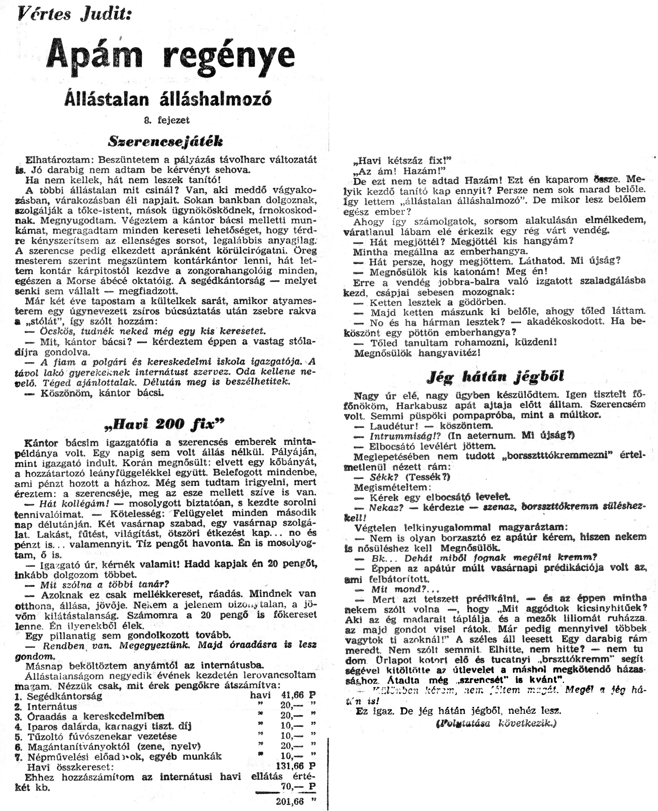Nyilvános 1466 | 2442 | Zalai Hírlap 1971.02.21. 044sz 08old - Apám regénye 08 | A következő szöveg a cikkből keletkezett automata szövegfelismertető segítségével: Vertes Judit: Apám regénye Állástalan álláshalmozó 8. fejezet Szerencsejáték Elhatároztam: Beszüntetem a pályázás távolharc változatát is. Jó darabig nem adtam be kérvényt sehova. Ha nem kellek, hát nem leszek tanító! A többi állástalan mit csinál? Van, aki meddő vágyakozásban, várakozásban éli napjait. Sokan bankban dolgoznak, szolgálják a tőke-istent, mások ügynökösködnek, írnokoskod-nak. Megnyugodtam. Végeztem a kántor bácsi melletti munkámat, megragadtam minden kereseti lehetőséget, hogy térdre kényszerítsem az ellenséges sorsot, legalábbis anyagilag. A szerencse pedig elkezdett apránként körülcirógatni. öreg mesterem szerint megszűntem kontárkántor lenni, hát lettem kontár kárpitostól kezdve a zongorahangolóig minden, egészen a Morse ábécé oktatóig. A segédkántorság — melyet senki sem vállalt — megfiadzott. Már két éve tapostam a kültelkek sarát, amikor atyamesterem egy úgynevezett zsíros búcsúztatás után zsebre rakva a „stólát", így szólt hozzám: — Öcskös, tudnék neked még egy kis keresetet. — Mit, kántor bácsi? — kérdeztem éppen a vastag stóla-díjra gondolva. — A fiam a polgári és kereskedelmi iskola igazgatója. A távol lakó gyerekéinek internátust szervez. Oda kellene nevelő. Téged ajánlottalak. Délután meg is beszélhetitek. — Köszönöm, kántor bácsi. „Havi 200 fix" Kántor bácsim igazgatófia a szerencsés emberek mintapéldánya volt. Egy napig sem volt állás nélkül. Pályáján, mint igazgató indult. Korán megnősült: elvett egy kőbányát, a hozzátartozó leányfüggelékkel együtt. Belefogott mindenbe, ami pénzt hozott a házhoz. Még sem tudtam irigyelni, mert éreztem: a szerencséje, meg az esze mellett szíve is van. — Hát kollégám! — mosolygott biztatóan, s kezdte sorolni tennivalóimat. — Kötelesség: Felügyelet minden második nap délutánján. Két vasárnap szabad, egy vasárnap szolgálat. Lakást, fűtést, világítást, ötszöri étkezést kap... no és pénzt is... valamennyit Tíz pengőt havonta. Én is mosolyogtam, ő is. — Igazgató úr, kérnék valamit! Hadd kapjak én 20 pengőt, inkább dolgozom többet. — Mit szólna a többi tanár? — Azoknak ez csak mellékkereset, ráadás. Mindnek van otthona, állása, jövője. Nekem a jelenem üizoi»> talán, a jö-vőm kilátástalanság. Számomra a 20 pengő is főkereset lenne. Én ilyenekből élek. Egy pillanatig sem gondolkozott tovább. — Rendben van. Megegyeztünk. Majd óraadásra is lesz gondom. Másnap beköltöztem anyámtól az internátusba. Állástalanságom negyedik évének kezdetén lerovancsoltam ma?am. Nézzük csak, mit érek pengőkre átszámítva: 1. Segédkán torság havi 41,66 P 2. Internátus " 20,— " 3. Óraadás a kereskedelmiben " 20,— " 4. Iparos dalárda, karnagyi tiszt, díj " 10,— " 5. Tűzoltó fúvószenekar vezetése " 10,— " 6. Magántanítványoktól (zene, nyelv) " 20,— " 7. Népművelési előad )-ok, egyéb munkák " 10,— " Havi összkereset: 131,66 P Ehhez hozzászámítom az internátusi havi ellátás értékét kb. 70,— P \'\'\' 201,63 " „Havi kétszáz fix!" „Az ám! Hazám!" De ezt nem te adtad Hazám! Ezt én kaparom Sssze. Melyik kezdő tanító kap ennyit? Persze nem sok marad belőle. Így lettem „állástalan álláshalmozó". De mikor lesz belőlem egész ember? Ahogy így számolgatok, sorsom alakulásán elmélkedem, Váratlanul lábam elé érkezik egy rég várt vendég. — Hát megjöttél? Megjöttél kis hangyám? Mintha megállna az emberhangya. — Hát persze, hogy megjöttem. Láthatod. Mi újság? — Megnősülök kis katonám! Meg én! Erre a vendég jobbra-balra való izgatott szaladgálásba kezd, csápjai sebesen mozognak: — Ketten lesztek a gödörben. — Majd ketten mászunk ki belőle, ahogy tőled láttam. — No és ha hárman lesztek? — akadékoskodott. Ha beköszönt egy pöttön emberhangya? — Tőled tanultam rohamozni, küzdeni! Megnősülök hangyavitéz! - Jég hátán jégből Nagy úr elé, nagy ügyben készülődtem. Igen tisztelt fő-főnököm, Harkabusz apát ajtaja előtt álltam. Szerencsém volt. Semmi püspöki pompapróba, mint a múltkor. — Laudétur! — köszöntem. — Intrummiság!? (In aeternum. Mi újság?) — Elbocsátó levélért jöttem. Meglepetésében nem tudott „borssztttókrernmezni" értelmetlenül nézett rám: — Séfcfc? (Tessék?) Megismételtem: — Kérek egy elboesátő levelet — Nekaz? — kérdezte — szenaz, borsszttökremm sütéshez-kell! Végtelen lelkinyugalommal magyaráztam: > — Nem is olyan borzasztó ez apátúr kérem, hiszen nekem Is nősüléshez kell Megnősülök. — Bk... Dehát miből fognak megélni kremm? — Éppen az apátúr múlt vasárnapi prédikációja volt az, ami felbátorított — Mit mond?... — Mert azt tetszeti prédikálni, — és 82 éppen mintha nekem szólt volna —, hogy „Mit aggódtok kicsinyhitűek? Aki az ég madarait táplálja, és a mezők liliomát ruházza. az majd gondot visel rátok. Már pedig mennyivel többek vagytok ti azoknál!" A széles áll leesett Egy darabig rám meredt. Nem szólt semmit. Elhitte, nem hitte? — nem tu dom Űrlapot kotort elő és tucatnyi ..brszttókremnV segít ségével kitöltötte az útlevelet a máshol megkötendő házassághoz. Átadta még „szreneset" is kvánt". - "::i:-;.bc:i kir:T., :iem ,\'í\'tem ir.::-áí. Megél <i )ég háti n is! Ez igaz. De jég hátán jégből, nehéz lesz. következik.) |