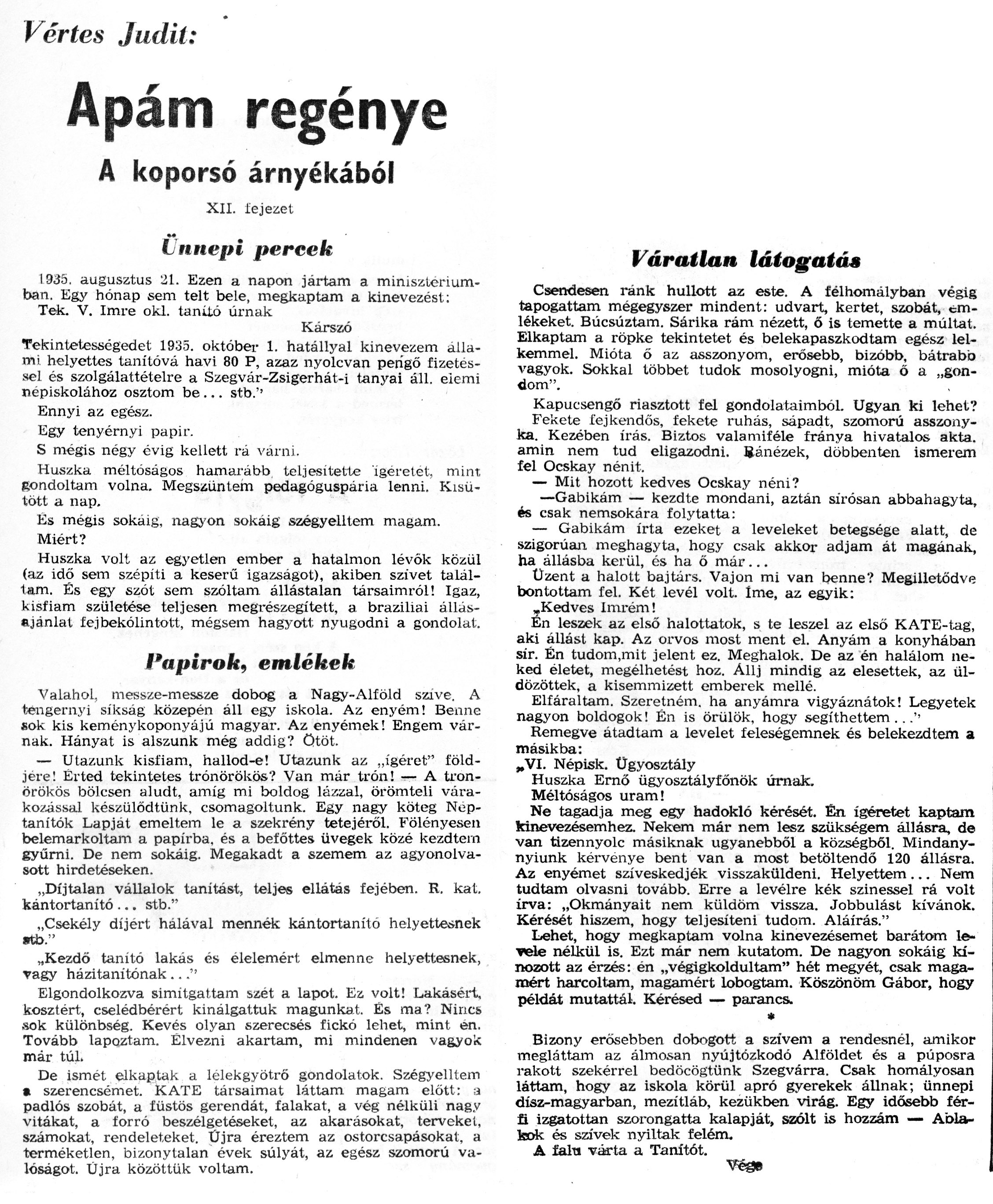 Nyilvános 1465 | 2438 | Zalai Hírlap 1971.03.21. 068sz 08old - Apám regénye 12 | A következő szöveg a cikkből keletkezett automata szövegfelismertető segítségével: Vértes Judit: Apám regénye A koporsó árnyékából XII. fejezet Ünnepi percek 1935. augusztus 21. Ezen a napon jártam a minisztériumban. Egy hónap sem telt bele, megkaptam a kinevezést: Tek. V. Imre oki. tanító úrnak Kárszó Tekintetességedet 1935. október 1. hatállyal kinevezem állami, helyettes tanítóvá havi 80 P, azaz nyolcvan pengő fizetéssel és szolgálattételre a Szegvár-Zsigerhát-i tanyai áll. elemi népiskolához osztom be... stb.\'1 Ennyi az egész. . . Egy tenyérnyi papir. S mégis négy évig kellett ra várni. Huszka méltóságos hamarább teljesítette ígéretet, mint gondoltam volna. Megszűntem pedagóguspária lenni. Kisütött a nap. És mégis sokáig, nagyon sokáig szégyelltem magam. Miért? Huszka volt az egyetlen ember a hatalmon lévók közül (az idő sem szépíti a keserű igazságot), akiben szivet találtam. És egy szót sem szóltam, állástalan társaimról! Igaz, kisfiam születése teljesen megrészegített, a braziliai állásajánlat fejbekólintott, mégsem hagyott nyugodni a gondolat. Papírok, emlékek Valahol, messze-messze dobog a Nagy-Alíöld szive. A tengernyi síkság közepén áll egy iskola. Az enyém! Benne sok. kis keménykoponyájú magyar. Az enyémek! Engem várnak. Hányat is alszunk még addig? ötöt. — Utazunk kisfiam, hallod-e! Utazunk az „ígéret" földjére! Érted tekintetes trónörökös? Van már trón! — A trónörökös bölcsen aludt, amíg mi boldog lázzal, örömteli várakozással készülődtünk, csomagoltunk. Egy nagy köteg Néptanítók Lapját emeltem le a szekrény tetejéről. Fölényesen belemarkoltam a papírba, és a beíőttes üvegek közé kezdtem gyűrni. De nem sokáig. Megakadt a szemem az agyonolvasott hirdetéseken. „Díjtalan vállalok tanítást, teljes ellátás fejében. R. kat. kántortanító ... stb." „Csekély díjért hálával mennék kántortanító helyettesnek «ü>." „Kezdő tanító lakás és élelemért elmenne helyettesnek, vagy házitanitónak ..." Elgondolkozva simitgattam szét a lapot. Ez volt! Lakásért, kosztért, cselédbérért kinálgattuk magunkat. És ma? Nincs sok különbség. Kevés olyan szerecsés fickó lehet, mint én. Tovább lapoztam. Élvezni akartam, mi mindenen vagyok már túl. De ismét elkaptak a lélekgyötrő gondolatok. Szégyelltem • szerencsémet. KATE társaimat láttam magam előtt: ;a padlós szobát, a füstös gerendát, falakat, a vég nélküli nagy vitákat, a forró beszélgetéseket, az akarásokat, terveket, számokat, rendeleteket. Üjra éreztem az ostorcsapásokat, a terméketlen, bizonytalan évek súlyát, az egész szomorú valóságot. Üjra közöttük voltam. Váratlan látogatás Csendesen ránk hullott az este. A félhomályban végig tapogattam mégegyszer mindent: udvart, kertet, szobát, emlékeket. Búcsúztam. Sárika rám nézett, ő is temette a múltat. Elkaptam a röpke tekintetet és belekapaszkodtam egész lel-kemmel. Mióta ő az asszonyom, erősebb, bizóbb, bátrabb vagyok. Sokkal többet tudok mosolyogni, mióta ő a „gondom". Kapucsengő riasztott fel gondolataimból. Ugyan ki lehet? Fekete fejkendős, fekete ruhás, sápadt, szomorú asszonyka. Kezében írás. Biztos valamiféle fránya hivatalos akta. amin nem tud eligazodni. Ránézek, döbbenten ismerem fel Ocskay nénit. — Mit hozott kedves Ocskay néni? —Gabikám — kezdte mondani, aztán sirósan abbahagyta, és csak nemsokára folytatta: — Gabikám írta ezeket a leveleket betegsége alatt, de szigorúan meghagyta, hogy csak akkor adjam át magának, ha állásba kerül, és ha ö már... Üzent a halott bajtárs. Vajon mi van benne? Megilletődve bontottam fel. Két levél volt. Íme, az egyik: ,Kedves Imrém! En leszek az első halottatok, s te leszel az első KATE-tag, aki állást kap. Az orvos most ment el. Anyám a konyhában sir. Én tudom.mit jelent ez. Meghalok. De az én halálom neked életet, megélhetést hoz. Állj mindig az elesettek, az üldözöttek, a kisemmizett emberek mellé. Elfáraltam. Szeretném, ha anyámra vigyáznátok! Legyetek nagyon boldogok! Én is örülök, hogy segíthettem .. .\'• Remegve átadtam a levelet feleségemnek és belekezdtem a másikba: „VI. Népisk. Ügyosztály Huszka Ernő ügyosztályfőnök úrnak. Méltóságos uram! Ne tagadja meg egy hadokló kérését. Én ígéretet kaptam kinevezésemhez. Nekem már nem lesz szükségem állásra, de van tizennyolc másiknak ugyanebből a községből. Mindany-nyiunk kérvénye bent van a most betöltendő 120 állásra. Az enyémet szíveskedjék visszaküldeni. Helyettem ... Nem tudtam olvasni tovább. Erre a levélre kék színessel rá volt írva: „Okmányait nem küldöm vissza. Jobbulást kívánok. Kérését hiszem, hogy teljesíteni tudom. Aláírás." Lehet, hogy megkaptam volna kinevezésemet barátom levele nélkül is. Ezt már nem kutatom. De nagyon sokáig kínozott az érzés: én „végigkoldultam" hét megyét, csak magamért harcoltam, magamért lobogtam. Köszönöm Gábor, hogy példát mutattál. Kérésed — parancs. * Bizony erősebben dobogott a szivem a rendesnél, amikor megláttam az álmosan nyújtózkodó Alföldet és a púposra rakott szekérrel bedöcög\'tünk Szegvárra. Csak homályosan láttam, hogy az iskola körül apró gyerekek állnak; ünnepi dísz-magyarban, mezítláb, kezükben virág. Egy idősebb férfi izgatottan szorongatta kalapját, szólt is hozzám — Ablakok és szívek nyíltak felém. A feht várta a Tanítót. |