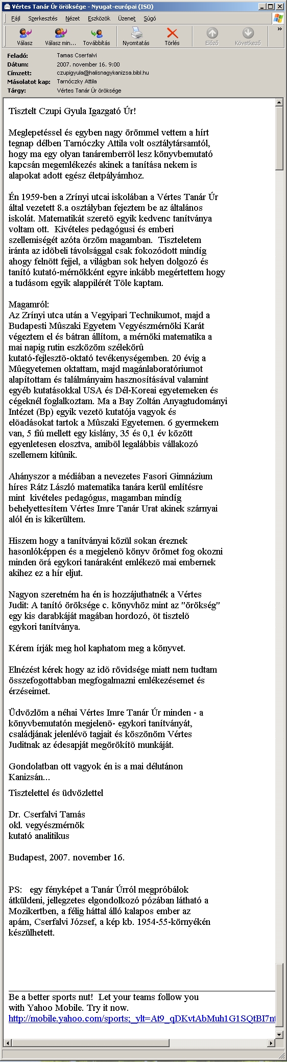 Nyilvános 1565 | 2758 | Cserfalvi tamás levele Vértes Imre estéjére | Tisztelt Czupi Gyula Igazgató Úr! Meglepetéssel és egyben nagy örömmel vettem a hírt tegnap délben Tarnóczky Attila volt osztálytársamtól, hogy ma egy olyan tanáremberről lesz könyvbemutató kapcsán megemlékezés akinek a tanítása nekem is alapokat adott egész életpályámhoz. Én 1959-ben a Zrínyi utcai iskolában a Vértes Tanár Úr által vezetett 8.a osztályban fejeztem be az általános iskolát. Matematikát szerető egyik kedvenc tanítványa voltam ott. Kivételes pedagógusi és emberi szellemiségét azóta őrzöm magamban. Tiszteletem iránta az időbeli távolsággal csak fokozódott mindíg ahogy felnőtt fejjel, a világban sok helyen dolgozó és tanító kutató-mérnökként egyre inkább megértettem hogy a tudásom egyik alappilérét Tőle kaptam. Magamról: Az Zrínyi utca után a Vegyipari Technikumot, majd a Budapesti Műszaki Egyetem Vegyészmérnöki Karát végeztem el és bátran állítom, a mérnöki matematika a mai napig rutin eszközöm szélekörű kutató-fejlesztő-oktató tevékenységemben. 20 évig a Műegyetemen oktattam, majd magánlaboratóriumot alapítottam és találmányaim hasznosításával valamint egyéb kutatásokkal USA és Dél-Koreai egyetemeken és cégeknél foglalkoztam. Ma a Bay Zoltán Anyagtudományi Intézet (Bp) egyik vezető kutatója vagyok és előadásokat tartok a Műszaki Egyetemen. 6 gyermekem van, 5 fiú mellett egy kislány, 35 és 0,1 év között egyenletesen elosztva, amiből legalábbis vállakozó szellemem kitűnik. Ahányszor a médiában a nevezetes Fasori Gimnázium híres Rátz László matematika tanára kerül említésre mint kivételes pedagógus, magamban mindíg behelyettesítem Vértes Imre Tanár Urat akinek szárnyai alól én is kikerültem. Hiszem hogy a tanítványai közül sokan éreznek hasonlóképpen és a megjelenő könyv örömet fog okozni minden őrá egykori tanáraként emlékező mai embernek akihez ez a hír eljut. Nagyon szeretném ha én is hozzájuthatnék a Vértes Judit: A tanító öröksége c. könyvhöz mint az "örökség" egy kis darabkáját magában hordozó, őt tisztelő egykori tanítványa. Kérem írják meg hol kaphatom meg a könyvet. Elnézést kérek hogy az idő rövidsége miatt nem tudtam összefogottabban megfogalmazni emlékezésemet és érzéseimet. Üdvözlöm a néhai Vértes Imre Tanár Úr minden - a könyvbemutatón megjelenő- egykori tanítványát, családjának jelenlévő tagjait és köszönöm Vértes Juditnak az édesapját megörökítő munkáját. Gondolatban ott vagyok én is a mai délutánon Kanizsán... Tisztelettel és üdvözlettel Dr. Cserfalvi Tamás okl. vegyészmérnök kutató analitikus Budapest, 2007. november 16. PS: egy fényképet a Tanár Úrról megpróbálok átküldeni, jellegzetes elgondolkozó pózában látható a Mozikertben, a félig háttal álló kalapos ember az apám, Cserfalvi József, a kép kb. 1954-55-környékén készülhetett. |