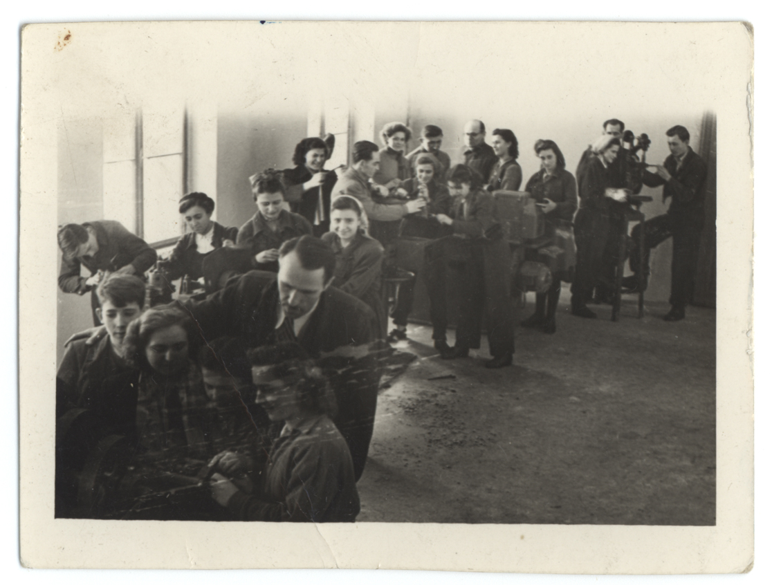 Műhelymunka télikabátban. Az előtérben Vértes Imre tanár úr (1953)