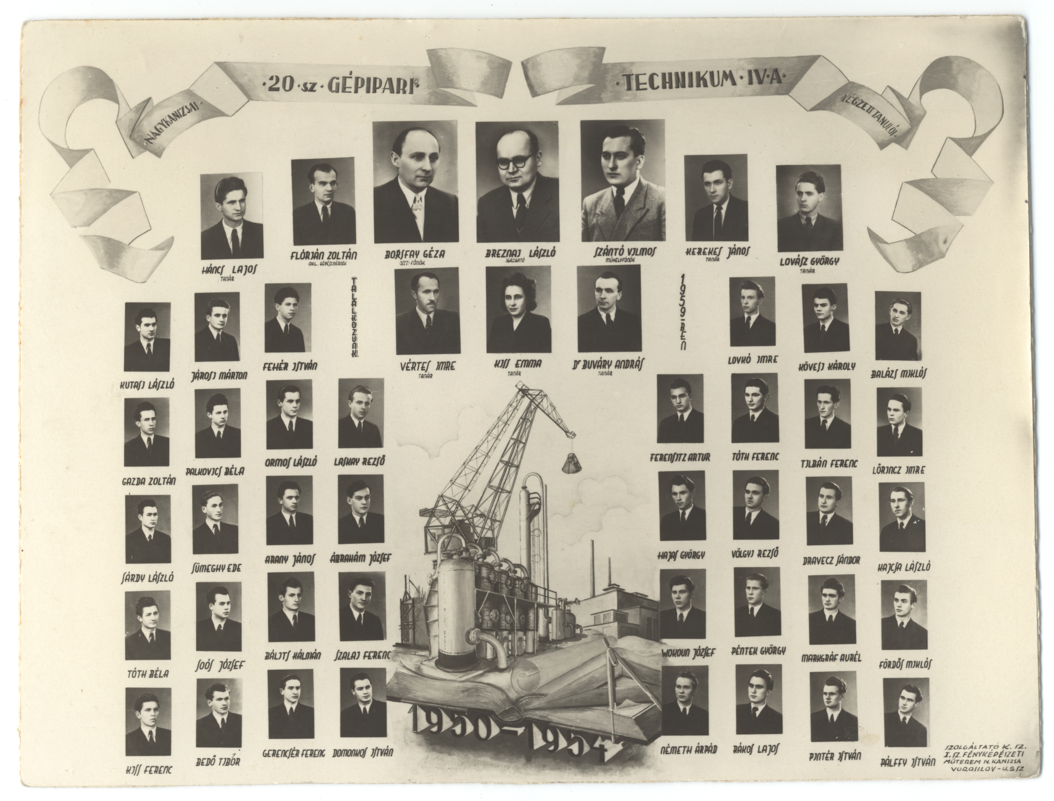 Nyilvános 1754 | 2797 | Nagykanizsai 20 sz Gépipari Technikum IV A végzett tanulói | Borsfay Géza osztályfőnök Breznai László igazgató Buváry András dr. Flórján Zoltán olk. gépészmérnök Háncs Lajos tanár Kerekes János tanár Kiss Emma tanár Lovász György tanár Szántó Vilmos műhelyfőnök Vértes Imre tanár Ábrahám József Arany János Balázs Miklós Bálits Kálmán Bedő Tibor Domonkos István Dravecz Sándor Fehér István Ferensitz Artur Fördős Miklós Gazda Zoltán Gerencsér Ferenc Hajas György Járosi Márton Kajcsa László Kiss Ferenc Kövesi Károly Kutasi László Laskay Rezső Lovkó Imre Lőrincz Imre Markgráf Aurél Németh Árpád Ormos László Pálffy István Palkovics Béla Péntek György Pintér István Rákos Lajos Sárdy László Soós József Sümeghy Ede Szalai Ferenc Tilbán Ferenc Tóth Béla Tóth Ferenc Völgyi Rezső Wokoun József |