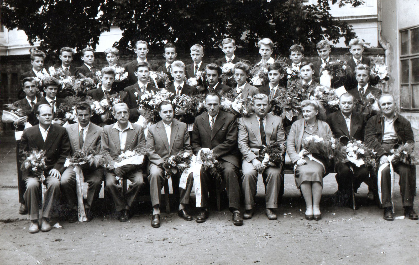 Nyilvános 1439 | 3259 | Osztályfénykép | - állnak felül: Buzek Dénes, Szerdahelyi (László), Bazsika János, Simon (József), Támba János, Büki Csaba, Cserfalvi Tamás, Domonkos (?), Márkus Gyula, Tóth József, Ujfalussy László, Bánáti József - állnak középen: Silló Elemér, Balogh Péter, Szuknai Lajos, Baumerth Gyula, Küronya István, Neményi Béla, Szalai Antal, Tarnóczky Attila, Lenkefi Csaba, Szilajka Lajos - ülnek (a tanárok): Alexander József, Kaczor Gyula, Pasqvaletti Antal, Szőnyi János, Vértes Imre, Horváth (Jenő?), Szőnyi Jánosné, Bérczes Imre(?), ...?... |