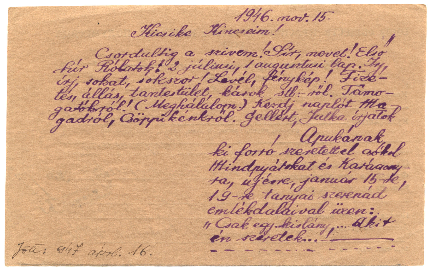 Nyilvános 1315 | 2487 | Vértes Imréné | Letenye IV. /Zala vm./ Magyarország Vértes Imre hdgy. U.R.S.S. "Moszkva" Vöröskereszt, Postafiók 430/1. c. 1946. nov. 15. Kicsike Kincseim! Csordultig a szívem! Sír, nevet! Első hír Rólatok: 2 júliusi, 1 augusztusi lap. Írj, írj sokat, sokszor! Levél, fénykép! Fizetés, állás, tantestület, káros stb.-ről. Támogatókról! (Meghálálom.) Kezdj naplót Magadról, Csöppikénkről. Gellért, Jutka írjatok Apukának ki forró szeretettel csókol Mindnyátokat és Karácsonyra, újévre, január 15-re, 19-re tanyai szerenád emlékdalaival üzen: "Csak egy kislány, ... akit én szeretek...!" Jött: 1947 áprl. 16. |