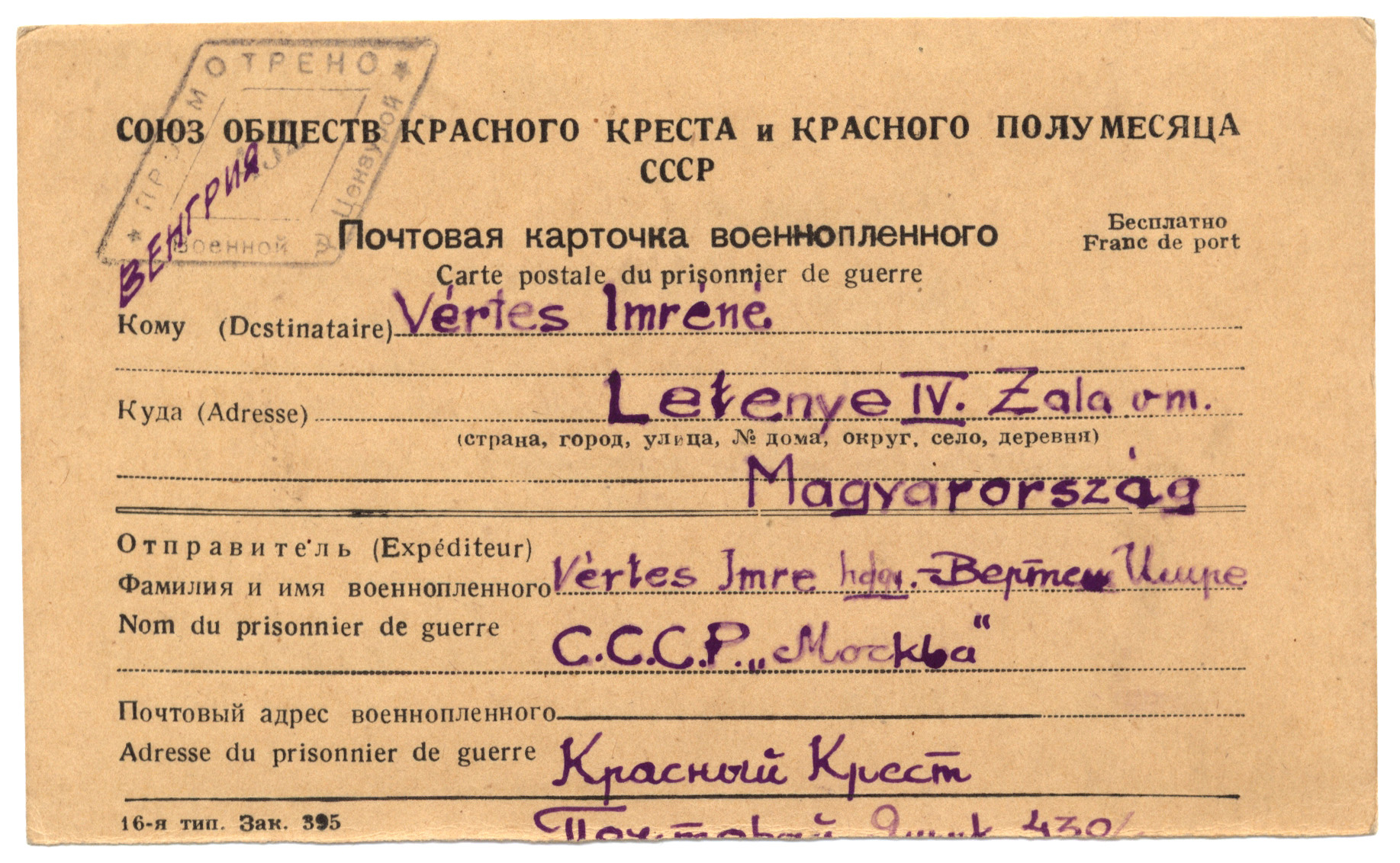 Nyilvános 1256 | 2175 | Vértes Imréné | Letenye IV. - Zala vm. Magyarország Vértes Imre hdgy. ... C.C.C.P. "Moszkva" Vöröskereszt, Postafiók 430/1. c. ... 1947. január 20. Kedveseim! Boldog, békés újévet, hitet, viszontlátást kérek, kérjetek; várok, várjatok! Semmi bajom! Eddig 6 lapot kaptam, huszat írtam, százat várok, ezer kérdésre feleletet. Százezer ünnepvággyal millió szeretetcsókkal álmodik Rólatok Apukátok Jött: 1947. áprl. 16. |