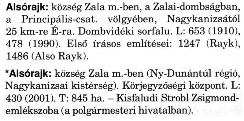 Nyilvános 2146 | 6590 | A szócikkek felismertetett szövege: | (A csillag után a kiegészítő kötetből származó szöveg következik) Alsórajk: község Zala m.-ben, a Zalai-dombságban, a Principális-csat. völgyében, Nagykanizsától 25 km-re É-ra. Dombvidéki sorfalu. L: 653 (1910), 478 (1990). Első írásos említései: 1247 (Rayk), 1486 (Also Rayk). * Alsórajk: község Zala m.-ben (Ny-Dunántúl régió, Nagykanizsai kistérség). Körjegyzőségi központ. L: 430 (2001). T: 845 ha. - Kisfaludi Strobl Zsigmondemlékszoba (a polgármesteri hivatalban). A szócikkek a következő lexikonból származnak: Cím: Magyar nagylexikon Közreműködő: Élesztős László (1949) (szerk.) ; Barabás Éva (1943) (szerk.) ; Berényi Gábor (1946) (szerk.) ; Bárány Lászlóné (szerk.) ; Adelmann-né Kertész Judit (1945) (közrem.) ; Froemel Károlyné Jáky Éva (1936) (közrem.) ; Akadémiai Kiadó és Nyomda Vállala Szerz. közl.: [... Élesztős László főszerk.] ; [szerk. Barabás Éva et al.] ; [bibliogr. Adelmanné Kertész Judit] ; [kész. az Akadémiai Kiadó Magyar Nagylexikon Szerkesztőségében] Kiadás: Budapest : Akad. K., 1993- Kötetei: 1. köt., A - Anc 2. köt., And - Bag 3. köt., Bah - Bij 4. köt., Bik - Bz 5. köt., C - Csem 6. köt., Csen - Ec 7. köt., Ed - Fe 8. köt., Ff - Gyep 9. köt., Gyer - Iq 10. köt., Ir - Kip 11. köt., Kir - Lem 12. köt., Len - Mep 13. köt., Mer - Nyk 14. köt., Nyl - Pom 15. köt., Pon - Sek 16. köt., Sel - Szö 17. köt., Szp - Ung 18. köt., Unh - Z 19. köt., Kiegészítő kötet, A - Z ETO jelzet: 030=945.11 Szakjelzet: 030 Cutter: M 14 ISBN: 963-05-6611-7 [!ISBN 963-05-6615-X] Nyelv: magyar Megjegyzés: Az 5. kötettől kiad. a Magyar Nagylexikon Kiadó ; A 6. kötettől főszerk. Berényi Gábor ; A 6. kötettől szakszerk. Bárány Lászlóné et al. ; A 6. kötettől bibliogr. Froemel Károlyné ; Bibliogr. a szócikkek végén |