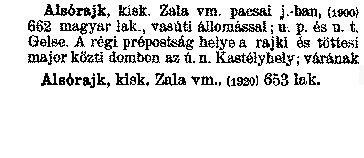 Nyilvános 2213 | 6226 | Alsórajk, kisk. Zala vm. pacsai j.-ban, (1900) 662 magyar lak., vasúti állomással ; u. p. és u. t. Gelse. A régi prépostság helye a rajki és töttesi major közti dombon az ú. n. Kastélyhely ; várának helye a mai Várhely. | Alsórajk kisk. Zala vm., (1920) 653 lak. Cím: Révai nagy lexikona Alcím: az ismeretek enciklopédiája Kiadás: Budapest : Révai testvérek, [1911]- Kötetei: 1. köt., A - Arany 2. köt., Arány - Beke 3. köt., Béke - Brutto 4. köt., Bratus - Csát 5. köt., Csata - Duc 6. köt., Duc - Etele 7. köt., Stelka - Földöv 8. köt., Földpálya - Gres 9. köt., Gréc - Herold 10. köt., Hérold - Jób 11. köt., Jób - Nontur 12. köt., Kontúr - Lovas 13. köt., Lovas - Mons 14. köt., Mens - Ottó 15. köt., Ottó - Racine 16. köt., Racine - Sodoma 17. köt., Sodoma - Tarján 18. köt., 19. köt., Vár - Zsüri | Kiegészítés Aachen - Beöthy 20. köt., Kiegészítés: Bér - Zsolt ETO jelzet: 03=945.11 Szakjelzet: 030 Cutter: R 62 Nyelv: magyar |