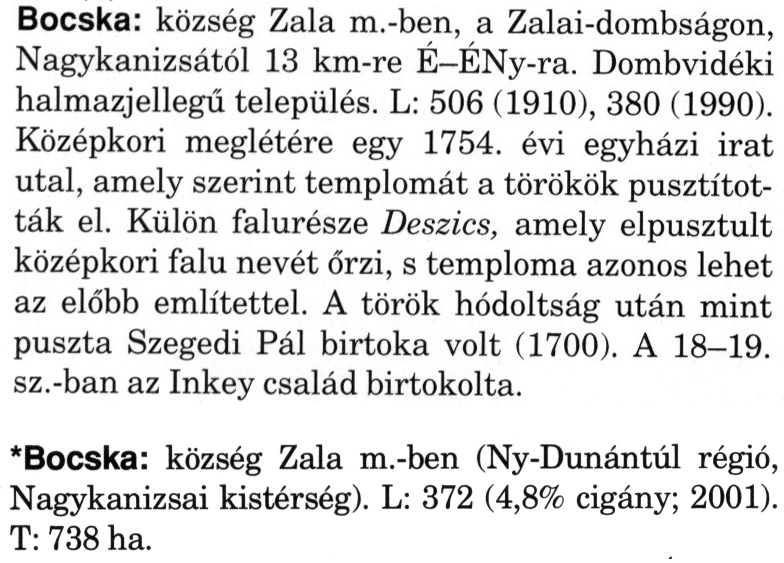 Nyilvános 2280 | 5888 | A szócikkek felismertetett szövege: | (A csillag után a kiegészítő kötetből származó szöveg következik) Bocska: község Zala m.-ben, a Zalai-dombságon, Nagykanizsától 13 km-re É-ÉNy-ra. Dombvidéki halmazjellegű település. L: 506 (1910), 380 (1990). Középkori meglétére egy 1754. évi egyházi irat utal, amely szerint templomát a törökök pusztították el. Külön falurésze Deszics, amely elpusztult középkori falu nevét őrzi, s temploma azonos lehet az előbb említettel. A török hódoltság után mint puszta Szegedi Pál birtoka volt (1700). A 18-19. sz.-ban az Inkey család birtokolta. *Bocska: község Zala m.-ben (Ny-Dunántúl régió, Nagykanizsai kistérség). L: 372 (4,8% cigány; 2001). T: 738 ha. A szócikkek a következő lexikonból származnak: Cím: Magyar nagylexikon Közreműködő: Élesztős László (1949) (szerk.) ; Barabás Éva (1943) (szerk.) ; Berényi Gábor (1946) (szerk.) ; Bárány Lászlóné (szerk.) ; Adelmann-né Kertész Judit (1945) (közrem.) ; Froemel Károlyné Jáky Éva (1936) (közrem.) ; Akadémiai Kiadó és Nyomda Vállala Szerz. közl.: [... Élesztős László főszerk.] ; [szerk. Barabás Éva et al.] ; [bibliogr. Adelmanné Kertész Judit] ; [kész. az Akadémiai Kiadó Magyar Nagylexikon Szerkesztőségében] Kiadás: Budapest : Akad. K., 1993- Kötetei: 1. köt., A - Anc 2. köt., And - Bag 3. köt., Bah - Bij 4. köt., Bik - Bz 5. köt., C - Csem 6. köt., Csen - Ec 7. köt., Ed - Fe 8. köt., Ff - Gyep 9. köt., Gyer - Iq 10. köt., Ir - Kip 11. köt., Kir - Lem 12. köt., Len - Mep 13. köt., Mer - Nyk 14. köt., Nyl - Pom 15. köt., Pon - Sek 16. köt., Sel - Szö 17. köt., Szp - Ung 18. köt., Unh - Z 19. köt., Kiegészítő kötet, A - Z ETO jelzet: 030=945.11 Szakjelzet: 030 Cutter: M 14 ISBN: 963-05-6611-7 [!ISBN 963-05-6615-X] Nyelv: magyar Megjegyzés: Az 5. kötettől kiad. a Magyar Nagylexikon Kiadó ; A 6. kötettől főszerk. Berényi Gábor ; A 6. kötettől szakszerk. Bárány Lászlóné et al. ; A 6. kötettől bibliogr. Froemel Károlyné ; Bibliogr. a szócikkek végén |