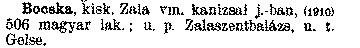 Nyilvános 2224 | 5886 | Cím: Révai nagy lexikona | Alcím: az ismeretek enciklopédiája Kiadás: Budapest : Révai testvérek, [1911]- Kötetei: 1. köt., A - Arany 2. köt., Arány - Beke 3. köt., Béke - Brutto 4. köt., Bratus - Csát 5. köt., Csata - Duc 6. köt., Duc - Etele 7. köt., Stelka - Földöv 8. köt., Földpálya - Gres 9. köt., Gréc - Herold 10. köt., Hérold - Jób 11. köt., Jób - Nontur 12. köt., Kontúr - Lovas 13. köt., Lovas - Mons 14. köt., Mens - Ottó 15. köt., Ottó - Racine 16. köt., Racine - Sodoma 17. köt., Sodoma - Tarján 18. köt., 19. köt., Vár - Zsüri | Kiegészítés Aachen - Beöthy 20. köt., Kiegészítés: Bér - Zsolt ETO jelzet: 03=945.11 Szakjelzet: 030 Cutter: R 62 Nyelv: magyar BOCSKA Bocska,kisk. Zala vm. kanizsai j.-ban, (1910) 506 magyar lak. ; u. p. Zalaszentbalázs, u. t. Gelse. |
