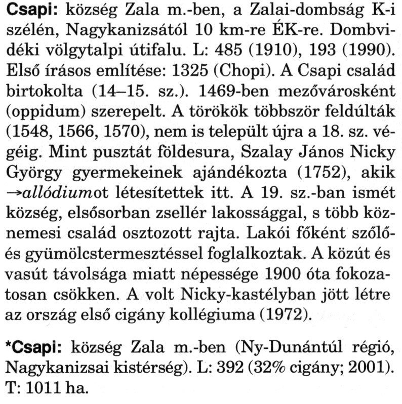 Nyilvános 2331 | 6431 | A szócikkek felismertetett szövege: | (A csillag után a kiegészítő kötetből származó szöveg következik) Csapi: község Zala m.-ben, a Zalai-dombság K-i szélén, Nagykanizsától 10 km-re ÉK-re. Dombvidéki völgytalpi útifalu. L: 485 (1910), 193 (1990). Első írásos említése: 1325 (Chopi). A Csapi család birtokolta (14-15. sz.). 1469-ben mezővárosként (oppidum) szerepelt. A törökök többször feldúlták (1548, 1566, 1570), nem is települt újra a 18. sz. végéig. Mint pusztát földesura, Szalay János Nicky György gyermekeinek ajándékozta (1752), akik → allódiumot létesítettek itt. A 19. sz.-ban ismét község, elsősorban zsellér lakossággal, s több köznemesi család osztozott rajta. Lakói főként szőlő-és gyümölcstermesztéssel foglalkoztak. A közút és vasút távolsága miatt népessége 1900 óta fokozatosan csökken. A volt Nicky-kastélyban jött létre az ország első cigány kollégiuma (1972). *Csapi: község Zala m.-ben (Ny-Dunántúl régió, Nagykanizsai kistérség). L: 392 (32% cigány; 2001). T: 1011 ha. A szócikkek a következő lexikonból származnak: Cím: Magyar nagylexikon Közreműködő: Élesztős László (1949) (szerk.) ; Barabás Éva (1943) (szerk.) ; Berényi Gábor (1946) (szerk.) ; Bárány Lászlóné (szerk.) ; Adelmann-né Kertész Judit (1945) (közrem.) ; Froemel Károlyné Jáky Éva (1936) (közrem.) ; Akadémiai Kiadó és Nyomda Vállala Szerz. közl.: [... Élesztős László főszerk.] ; [szerk. Barabás Éva et al.] ; [bibliogr. Adelmanné Kertész Judit] ; [kész. az Akadémiai Kiadó Magyar Nagylexikon Szerkesztőségében] Kiadás: Budapest : Akad. K., 1993- Kötetei: 1. köt., A - Anc 2. köt., And - Bag 3. köt., Bah - Bij 4. köt., Bik - Bz 5. köt., C - Csem 6. köt., Csen - Ec 7. köt., Ed - Fe 8. köt., Ff - Gyep 9. köt., Gyer - Iq 10. köt., Ir - Kip 11. köt., Kir - Lem 12. köt., Len - Mep 13. köt., Mer - Nyk 14. köt., Nyl - Pom 15. köt., Pon - Sek 16. köt., Sel - Szö 17. köt., Szp - Ung 18. köt., Unh - Z 19. köt., Kiegészítő kötet, A - Z ETO jelzet: 030=945.11 Szakjelzet: 030 Cutter: M 14 ISBN: 963-05-6611-7 [!ISBN 963-05-6615-X] Nyelv: magyar Megjegyzés: Az 5. kötettől kiad. a Magyar Nagylexikon Kiadó ; A 6. kötettől főszerk. Berényi Gábor ; A 6. kötettől szakszerk. Bárány Lászlóné et al. ; A 6. kötettől bibliogr. Froemel Károlyné ; Bibliogr. a szócikkek végén |
