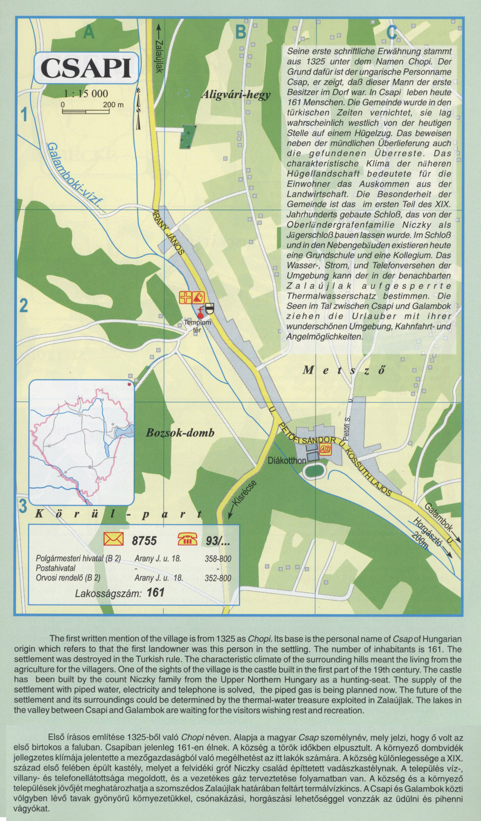 Nyilvános 2328 | 7993 | CSAPI | Első írásos említése 1325-ből való Chopi néven. Alapja a magyar Csap személynév, mely jelzi, hogy ő volt az első birtokos a faluban. Csapiban jelenleg 161-en élnek. A község a török időkben elpusztult. A környező dombvidék jellegzetes klímája jelentette a mezőgazdaságból való megélhetést az itt lakók számára. A község különlegessége a XIX. század első felében épült kastély, melyet a felvidéki gróf Niczky család építtetett vadászkastélynak. A település víz-, villany- és telefonellátottsága megoldott, és a vezetékes gáz terveztetése folyamatban van. A község és a környező települések jövőjét meghatározhatja a szomszédos Zalaújlak határában feltárt termálvízkincs. ACsapi és Galambok közti völgyben lévő tavak gyönyörű környezetükkel, csónakázási, horgászási lehetőséggel vonzzák az üdülni és pihenni vágyókat. Seine erste schriftliche Erwähnung stammt aus 1325 unter dem Namen Chopi. Der Grund dafür ist der ungarische Personname Csap, er zeigt, daß dieser Mann der erste Besitzer im Dorf war. In Csapi leben heute 161 Menschen. Die Gemeinde wurde in den türkischen Zeiten vernichtet, sie lag wahrscheinlich westlich von der heutigen Stelle auf einem Hügelzug. Das beweisen neben der mündlichen Überlieferung auch die gefundenen Überreste. Das charakteristische Klima der näheren Hügellandschaft bedeutete für die Einwohner das Auskommen aus der Landwirtschaft. Die Besonderheit der Gemeinde ist das im ersten Teil des XIX. Jahrhunderts gebaute Schloß, das von der Oberländergrafenfamilie Niczky als Jägerschloß bauen lassen wurde. Im Schloß und in den Nebengebäuden existieren heute eine Grundschule und eine Kollegium. Das Wasser-, Strom, und Telefonversehen der Umgebung kann der in der benachbarten Z a I a ú j I a k aufgesperrte Thermalwasserschatz bestimmen. Die Seen im Tal zwischen Csapi und Galambok ziehen die Urlauber mit ihrer wunderschönen Umgebung, Kahnfahrt- und Angelmöglichkeiten. The first written mention of the village is from 1325 as Chopi. Its base is the personal name of Csap of Hungarian origin which refers to that the first landowner was this person in the settling. The number of inhabitants is 161. The settlement was destroyed in the Turkish rule. The characteristic climate of the surrounding hills meant the living from the agriculture for the villagers. One of the sights of the village is the castle built in the first part of the 19th century. The castle has been built by the count Niczky family from the Upper Northern Hungary as a hunting-seat. The supply of the settlement with piped water, electricity and telephone is solved, the piped gas is being planned now. The future of the settlement and its surroundings could be determined by the thermal-water treasure exploited in Zalaújlak. The lakes in the valley between Csapi and Galambok are waiting forthe visitors wishing rest and recreation. A részlet a következő kiadványból származik/Die Teile stammen vom volgenden Buch/This text came from the following book: Cím/Titel/Title: Zala megye településeinek atlasza - 257 település részletes térképe/Atlas der Komitat Zala - 257 Detailte Siedlungskarten/Zala county\'s Atlas - 257 settlement maps. Közreműködő/contributor: Lackner László (1943) (fotó) Kiadás/Ausgabe/Publisher: Gyula : HISZI-MAP, 1997 Sorozat/Serie/Series: Indulástól - megérkezésig... ETO: 912(439.121-2) ; 908.439.121 Cutter: Z 19 ISBN: 963-610-025-4 Oldalszám/Seiten/Pages: 323, 81 p. Megjegyzés/Note: Lezárva/Abgeschlossen am/Closed am: 1997. máj. 30. |