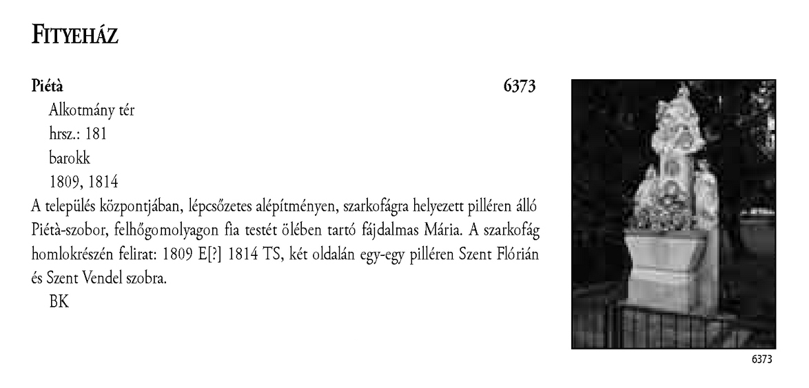 Nyilvános 2194 | 6451 | Fityeház - Magyarország műemlékjegyzéke - Zala megye 2006 027old | A részlet szövege: FITYEHÁZ Piétà 6373 Alkotmány tér hrsz.: 181 barokk 1809, 1814 A település központjában, lépcsőzetes alépítményen, szarkofágra helyezett pilléren álló Piétà-szobor, felhőgomolyagon fia testét ölében tartó fájdalmas Mária. A szarkofág homlokrészén felirat: 1809 E[?] 1814 TS, két oldalán egy-egy pilléren Szent Flórián és Szent Vendel szobra. BK A részlet a következő könyv online változatából származik: Cím: Magyarország műemlékjegyzéke Közreműködő: Haris Andrea. (szerk.) ; Kulturális Örökségvédelmi Hivatal (Budapest) (közread.) ; Somorjay Sélysette. (szerk.) ; Bardoly István (közrem.) Szerz. közl.: [sorozatszerk. Haris Andrea, Somorjay Sélysette] ; [mtárs Bardoly István] ; [közread. a] Kulturális Örökségvédelmi Hivatal. Kiadás: Budapest : KÖH, 2006 Kötetadat: Zala megye ISBN: 963-86510-7-5 ö ISBN: 963 7474 10 2 Nyelv: magyar A jegyzék a Kultúrális Örökségvédelmi Hivatal honlapján, a következő link alatt található: http://www.koh.hu/index.php?_mp=nyitolap&_amp=MUEML A fejléc adatairól 1. Objektum neve – törzsszám A fejléc első sora a műemlék eredeti rendeltetésének megfelelő nevet tartalmazza. Mögötte zárójelben templom esetében annak titulusa, más épületeknél indokolt esetben az eredeti rendeltetéstől eltérő, mai használatra utaló intézmény név (pl. városháza, múzeum, szálloda, oktatási intézmény hivatalos neve, stb.) olvasható. A törzsszám (trsz.) a műemlék egyetlen soha nem változó adata. A gyors azonosítás, illetve a törzsszám szerinti keresés lehetősége végett az objektummal egy sorban, a fejléc jobb szélén kiemelten jelenik meg. Összetartozó műemlék részek vagy történetileg egy együttest alkotó műemlékek sokszor külön törzsszámon lettek műemlékké nyilvánítva. Előfordulhat ezért, hogy egy fejléc alatt a leíró részben több, külön törzsszámmal rendelkező objektum szerepel. A törzsszámot ezekben az esetekben is az objektummal egy sorban tüntetjük fel. 2. Utca, házszám Egy utcán belül, amennyiben a számozás ezt lehetővé teszi, először a templomot adjuk meg, ezt követi a parókia, majd egyéb objektumok, pl. szobrok következnek. Házszám nélkül említünk egyes műemlékfajtákat (elsősorban templomokat), amennyiben a topográfiai azonosítás szempontjából a házszám közömbös vagy éppen zavaró. Előfordul, hogy a műemlék nem köthető nevesített közterülethez. Az ilyeneket a település végéhez soroltuk, és a leírásban kitértünk a településen belül elfoglalt helyükre. 3. Helyrajzi szám Ha egy helyrajzi számon és egy címen (pl. temetőben) több, külön törzsszámmal védett objektum van, akkor az együttesre utaló műemlék megnevezés alatt a közös adatokat egyszer adjuk meg. Ezt követően külön címszavanként következik a műemlékek leírása. Ilyen esetben az emlékeket mutatóztuk. Ezt az eljárást követtük, tekintet nélkül arra, hogy a teljes együttes védett-e vagy sem. (Védett együttes mellett mindig törzsszám szerepel.) Ha több helyrajzi szám is tartozik egy törzsszámhoz, akkor a fejlécben valamennyi számot feltüntettük. Amennyiben ilyen esetben több elemből álló műemlékről van szó, akkor a leíró részben minden külön említett elem után zárójelben megadjuk a vonatkozó helyrajzi számot. 4. Stílus A műemléket jelenleg meghatározó, domináns stílusjegy alapján került meghatározásra. Egyéb, érzékelhető stíluselemekre a leíró részben utalunk. 5. Datálás A műemléket jelenleg leginkább jellemző építési dátum. Korábbi építési periódusokra, illetve későbbi átépítésekre a történeti részben utalunk, fennmaradt részletek esetén lehetőség szerint azokra vonatkoztatva. A leírás A műemlékek leírása tartalmilag öt szakaszból áll, amely folyamatos szövegként jelenik meg. Az objektum topográfiai meghatározása a műemlék településen belüli vagy ahhoz viszonyított helyét adja meg, amennyiben ez az azonosításhoz nélkülözhetetlen, avagy azt segíti. Az emlék jellegének leírása utal a környezettel való kapcsolatra (tájolás, beépítés módja, környező terepviszonyok, amennyiben ezek jellemzőek), alaprajzi elrendezésre, tömegre és a jellegzetes homlokzati elemekre (pl. rizalitok, erkélyek, stb.). Részletes homlokzatleírás nem volt cél. Belső építészeti részletet csak akkor említünk meg, ha ez tartozékként jelentős, esetleg a datálás vagy a stílus meghatározás alapjául szolgált. Ezt követi az épület tartozékainak és berendezésének utalásszerű ismertetése (falfestés, üvegablak, berendezés), az adott elem után zárójelben az ismert mesterek nevével; az orgonát külön említjük, amennyiben hangszerként is műemléki értékkel bír. A mesternevekre, berendezésre történő utalás jelzésszerű, tételes információért a KÖH műemléki nyilvántartásához kell fordulni. A leírást az építéstörténet lényegesnek ítélt momentumainak felsorolása követi, a fejléc tartalmának megismétlése nélkül. Csak olyan adatokat szerepeltetünk, amelyek az építéstörténet szempontjából meghatározóak. A leírásban az építész és az építtető nevére, illetve a kivitelezőre külön utalás történik zárójelben. Az épület egyes részleteire vonatkozó építési dátumokat lehetőség szerint a leíró részben, az egyes épületrészek leírása után közöljük. Zala megye műemlékeinek revíziójára 2002–2003-ban került sor, a kéziratot 2006. augusztus 14-én zártuk le. A műemlékjegy-zék a KÖH hivatalos kiadványa, mely a Műemlékvédelmi Tudományos Intézet gondozásában jelenik meg. RÖVIDÍTÉSEK D – dél É – észak ev. – evangélikus gör. kat. – gör
