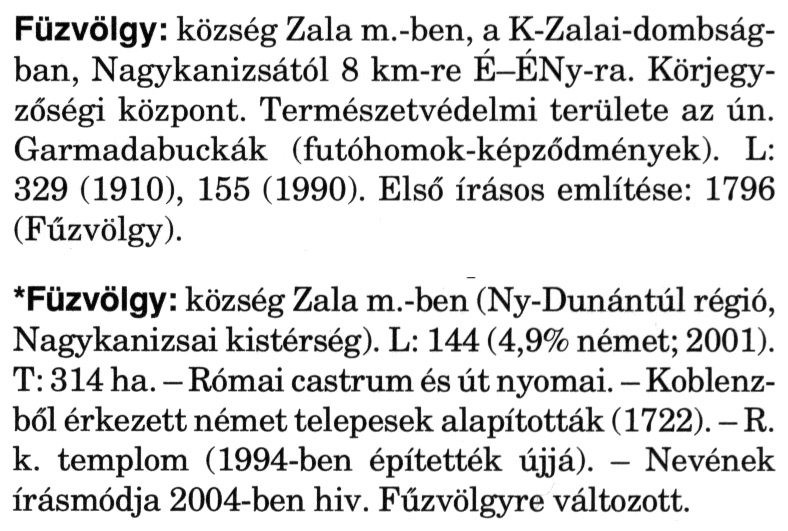 Nyilvános 2265 | 6177 | A szócikkek felismertetett szövege: | (A csillag után a kiegészítő kötetből származó szöveg következik) Füzvölgy: község Zala m.-ben, a K-Zalai-dombság-ban, Nagykanizsától 8 km-re É-ÉNy-ra. Körjegyzőségi központ. Természetvédelmi területe az ún. Garmadabuckák (futóhomok-képződmények). L: 329 (1910), 155 (1990). Első írásos említése: 1796 (Fűzvölgy). *Füzvölgy: község Zala m.-ben (Ny-Dunántúl régió, Nagykanizsai kistérség). L: 144 (4,9% német; 2001). T: 314 ha. - Római castrum és út nyomai. - Koblenz-ből érkezett német telepesek alapították (1722). - R. k. templom (1994-ben építették újjá). - Nevének írásmódja 2004-ben hiv. Fűzvölgyre változott. A szócikkek a következő lexikonból származnak: Cím: Magyar nagylexikon Közreműködő: Élesztős László (1949) (szerk.) ; Barabás Éva (1943) (szerk.) ; Berényi Gábor (1946) (szerk.) ; Bárány Lászlóné (szerk.) ; Adelmann-né Kertész Judit (1945) (közrem.) ; Froemel Károlyné Jáky Éva (1936) (közrem.) ; Akadémiai Kiadó és Nyomda Vállala Szerz. közl.: [... Élesztős László főszerk.] ; [szerk. Barabás Éva et al.] ; [bibliogr. Adelmanné Kertész Judit] ; [kész. az Akadémiai Kiadó Magyar Nagylexikon Szerkesztőségében] Kiadás: Budapest : Akad. K., 1993- Kötetei: 1. köt., A - Anc 2. köt., And - Bag 3. köt., Bah - Bij 4. köt., Bik - Bz 5. köt., C - Csem 6. köt., Csen - Ec 7. köt., Ed - Fe 8. köt., Ff - Gyep 9. köt., Gyer - Iq 10. köt., Ir - Kip 11. köt., Kir - Lem 12. köt., Len - Mep 13. köt., Mer - Nyk 14. köt., Nyl - Pom 15. köt., Pon - Sek 16. köt., Sel - Szö 17. köt., Szp - Ung 18. köt., Unh - Z 19. köt., Kiegészítő kötet, A - Z ETO jelzet: 030=945.11 Szakjelzet: 030 Cutter: M 14 ISBN: 963-05-6611-7 [!ISBN 963-05-6615-X] Nyelv: magyar Megjegyzés: Az 5. kötettől kiad. a Magyar Nagylexikon Kiadó ; A 6. kötettől főszerk. Berényi Gábor ; A 6. kötettől szakszerk. Bárány Lászlóné et al. ; A 6. kötettől bibliogr. Froemel Károlyné ; Bibliogr. a szócikkek végén |