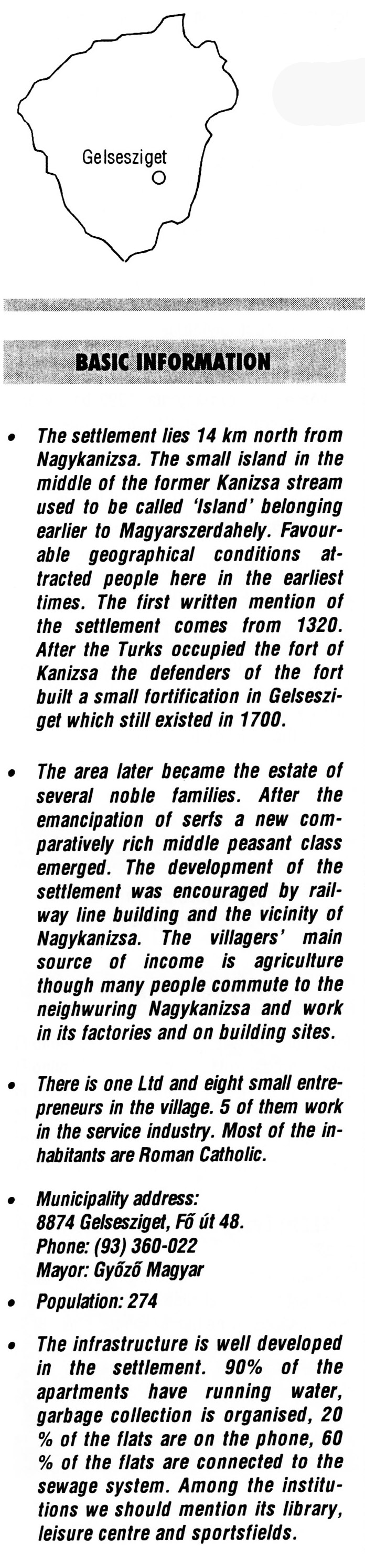 Nyilvános 2230 | 6436 | Gelsesziget | BASIC INFORMATION • The settlement lies 14 km north from Nagykanizsa. The small island in the middle of the former Kanizsa stream used to be called \'Island\' belonging earlier to Magyarszerdahely. Favourable geographical conditions attracted people here in the earliest times. The first written mention of the settlement comes from 1320. After the Turks occupied the fort of Kanizsa the defenders of the fort built a small fortification in Gelsesziget which still existed in 1700. • The area later became the estate of several noble families. After the emancipation of serfs a new comparatively rich middle peasant class emerged. The development of the settlement was encouraged by railway line building and the vicinity of Nagykanizsa. The villagers\' main source of income is agriculture though many people commute to the neighwuring Nagykanizsa and work in its factories and on building sites. • There is one Ltd and eight small entrepreneurs in the village. 5 of them work in the service industry. Most of the inhabitants are Roman Catholic. • Municipality address: 8874 Gelsesziget, Fő út 48. Phone: (93) 360-022 Mayor: Győző Magyar • Population: 274 • The infrastructure is well developed in the settlement. 90% of the apartments have running water, garbage collection is organised, 20 % of the flats are on the phone, 60 % of the flats are connected to the sewage system. Among the institutions we should mention its library, leisure centre and sportsfields. This text came from the following book: Title: Handbook of Zala county (Zala megye kézikönyve) Series: County handbooks of Hungary (Magyarország megyei kézikönyvei) Chief editor: Hóbor József Publisher: (Hatvan), CEBA-Hungary Ltd, 1998 ETO: 908.439.121(035) ; 050.8(439.121) ISBN: 963-9089-18-2 Pages: 488-1040 p. Remark: Closed on: 1998. márc. 31. |