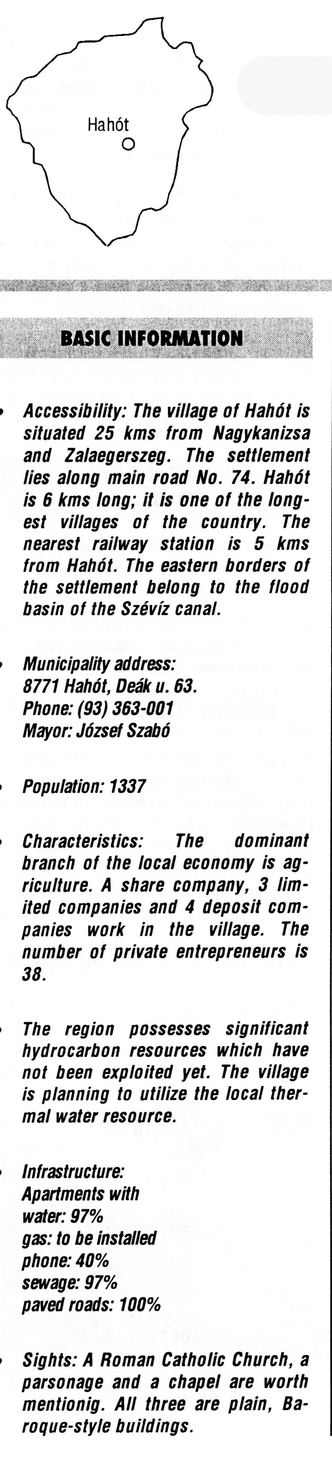Nyilvános 2473 | 6705 | Hahót | BASIC INFORMATION Accessibility: The village of Hahót is situated 25 kms from Nagykanizsa and Zalaegerszeg. The settlement lies along main road No. 74. Hahót is 6 kms long; it is one of the longest villages of the country. The nearest railway station is 5 kms from Hahót. The eastern borders of the settlement belong to the flood basin of the Szévíz canal. Municipality address: 8771 Hahót, Deák u. 63. Phone: (93) 363-001 Mayor: József Szabó Population: 1337 Characteristics: The dominant branch of the local economy is agriculture. A share company, 3 limited companies and 4 deposit companies work in the village. The number of private entrepreneurs is 38. The region possesses significant hydrocarbon resources which have not been exploited yet. The village is planning to utilize the local thermal water resource. Infrastructure: Apartments with water: 97% gas: to be installed phone: 40% sewage: 97% paved roads: 100% Sights: A Roman Catholic Church, a parsonage and a chapel are worth mentionig. All three are plain, Baroque-style buildings. This text came from the following book: Title: Handbook of Zala county (Zala megye kézikönyve) Series: County handbooks of Hungary (Magyarország megyei kézikönyvei) Chief editor: Hóbor József Publisher: (Hatvan), CEBA-Hungary Ltd, 1998 ETO: 908.439.121(035) ; 050.8(439.121) ISBN: 963-9089-18-2 Pages: 488-1040 p. Remark: Closed on: 1998. márc. 31. |