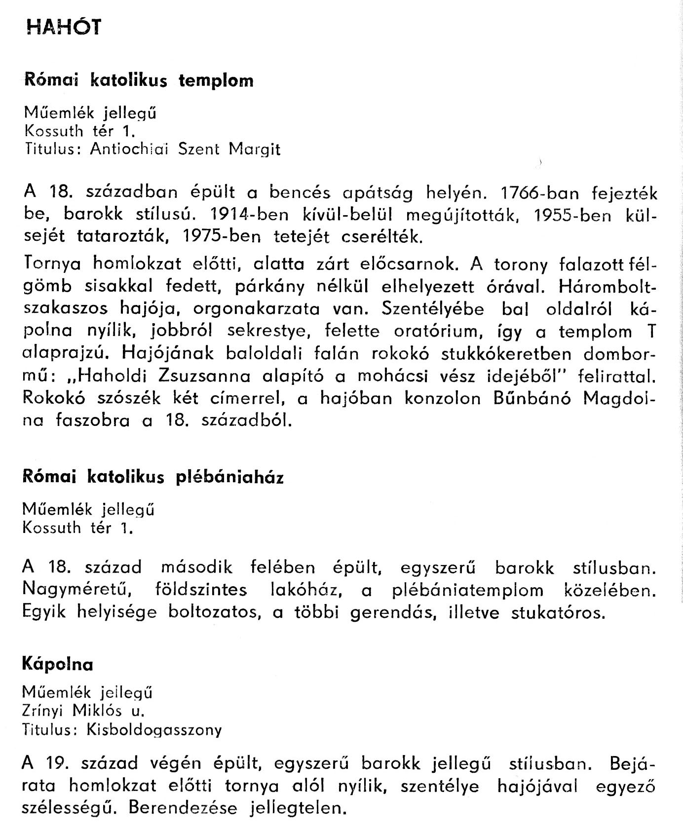 Nyilvános 2097 | 4199 | Hahót - Zala megye műemlékei 1979 072-073old | A részlet szövege: HAHÓT Római katolikus templom Műemlék jellegű Kossuth tér 1. Titulus: Antiochiai Szent Margit A 18. században épült a bencés apátság helyén. 1766-ban fejezték be, barokk stílusú. 1914-ben kívül-belül megújították, 1955-ben külsejét tatarozták, 1975-ben tetejét cserélték. Tornya homlokzat előtti, alatta zárt előcsarnok. A torony falazott félgömb sisakkal fedett, párkány nélkül elhelyezett órával. Háromboltszakaszos hajója, orgonakarzata van. Szentélyébe bal oldalról kápolna nyílik, jobbról sekrestye, felette oratórium, így a templom T alaprajzú. Hajójának baloldali falán rokokó stukkókeretben dombormű: „Haholdi Zsuzsanna alapító a mohácsi vész idejéből" felirattal. Rokokó szószék két címerrel, a hajóban konzolon Bűnbánó Magdolna faszobra a 18. századból. Római katolikus plébániaház Műemlék jellegű Kossuth tér 1. A 18. század második felében épült, egyszerű barokk stílusban. Nagyméretű, földszintes lakóház, a plébániatemplom közelében. Egyik helyisége boltozatos, a többi gerendás, illetve stukataros. Kápolna Műemlék jellegű Zrínyi Miklós u. Titulus: Kisboldogasszony A 19. század végén épült, egyszerű barokk jellegű stílusban. Bejárata homlokzat előtti tornya alól nyílik, szentélye hajójával egyező szélességű. Berendezése jellegtelen. A részlet a következő könyvből származik: Cím: Zala megye műemlékei Szerző: Németh József (1928) Közreműködő: Vándor László (szerk.) ; Szabóky Zsolt (1941) (fotó) Szerz. közl.: Németh József ; [szerk. Vándor László] ; [fotók... Szabóky Zsolt] Kiadás jelzés: 2. bőv. kiad. Kiadás: Zalaegerszeg : Zalai Ny., 1979 ETO jelzet: 72(439.121) ; 7.025.3/.4(439.121) ; 908.439.121 Tárgyszó: Zala Szakjelzet: 908 Cutter: N 53 Nyelv: magyar Oldalszám: 134 p. |