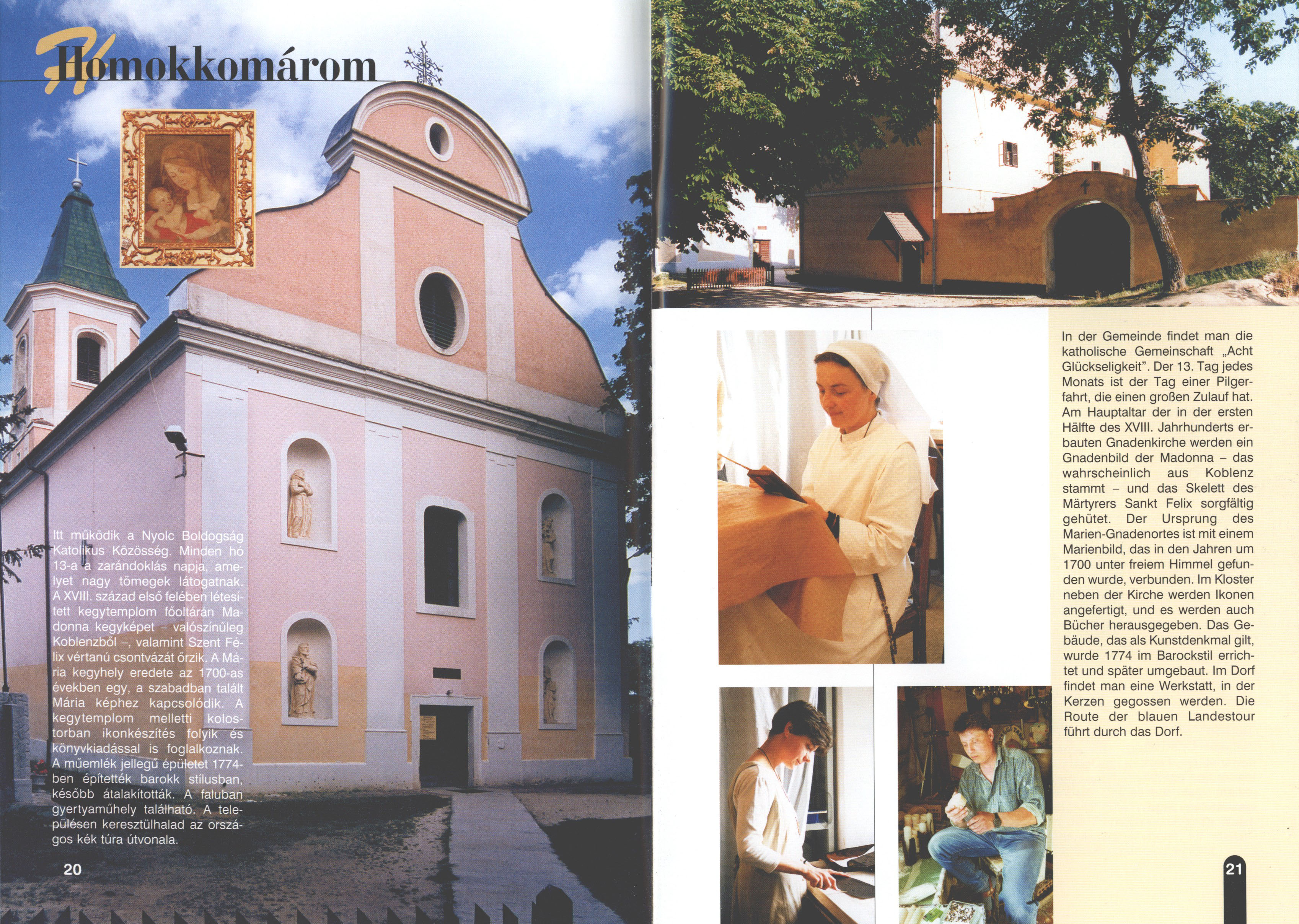 Nyilvános 2265 | 5961 | Homokkomárom | In der Gemeinde findet man die katholische Gemeinschaft „Acht Glückseligkeit". Der 13. Tag jedes Monats ist der Tag einer Pilgerfahrt, die einen großen Zulauf hat. Am Hauptaltar der in der ersten Hälfte des XVIII. Jahrhunderts erbauten Gnadenkirche werden ein Gnadenbild der Madonna - das wahrscheinlich aus Koblenz stammt - und das Skelett des Märtyrers Sankt Felix sorgfältig gehütet. Der Ursprung des Marien-Gnadenortes ist mit einem Marienbild, das in den Jahren um 1700 unter freiem Himmel gefunden wurde, verbunden. Im Kloster neben der Kirche werden Ikonen angefertigt, und es werden auch Bücher herausgegeben. Das Gebäude, das als Kunstdenkmal gilt, wurde 1774 im Barockstil errichtet und später umgebaut. Im Dorf findet man eine Werkstatt, in der Kerzen gegossen werden. Die Route der blauen Landestour führt durch das Dorf. Dieses Text stammt von: Titel: Hívogató a Régiók Kapujában - Útikönyv Látnivalók Nagykanizsán és Térségében (Einladend in dem Tor des Gebiets - Reisebuch - Sehenswürdigkeiten in Nagykanizsa und Umgebung) Herausgegeben von: Nagykanizsa és a Környező Települések Területfejlesztési Társulása (Verein für Gebietsentwicklung in Nagykanizsa und in ihrer Umgebung) 8800 Nagykanizsa, Petőfi Sándor út 5. Tel.: 06 93/536-453 • 06 93/536-454 Tel ./Fax: 06 93/326-323 E-mail: terstars@axelero.hu www.kanizsaterseg.celodin.hu |