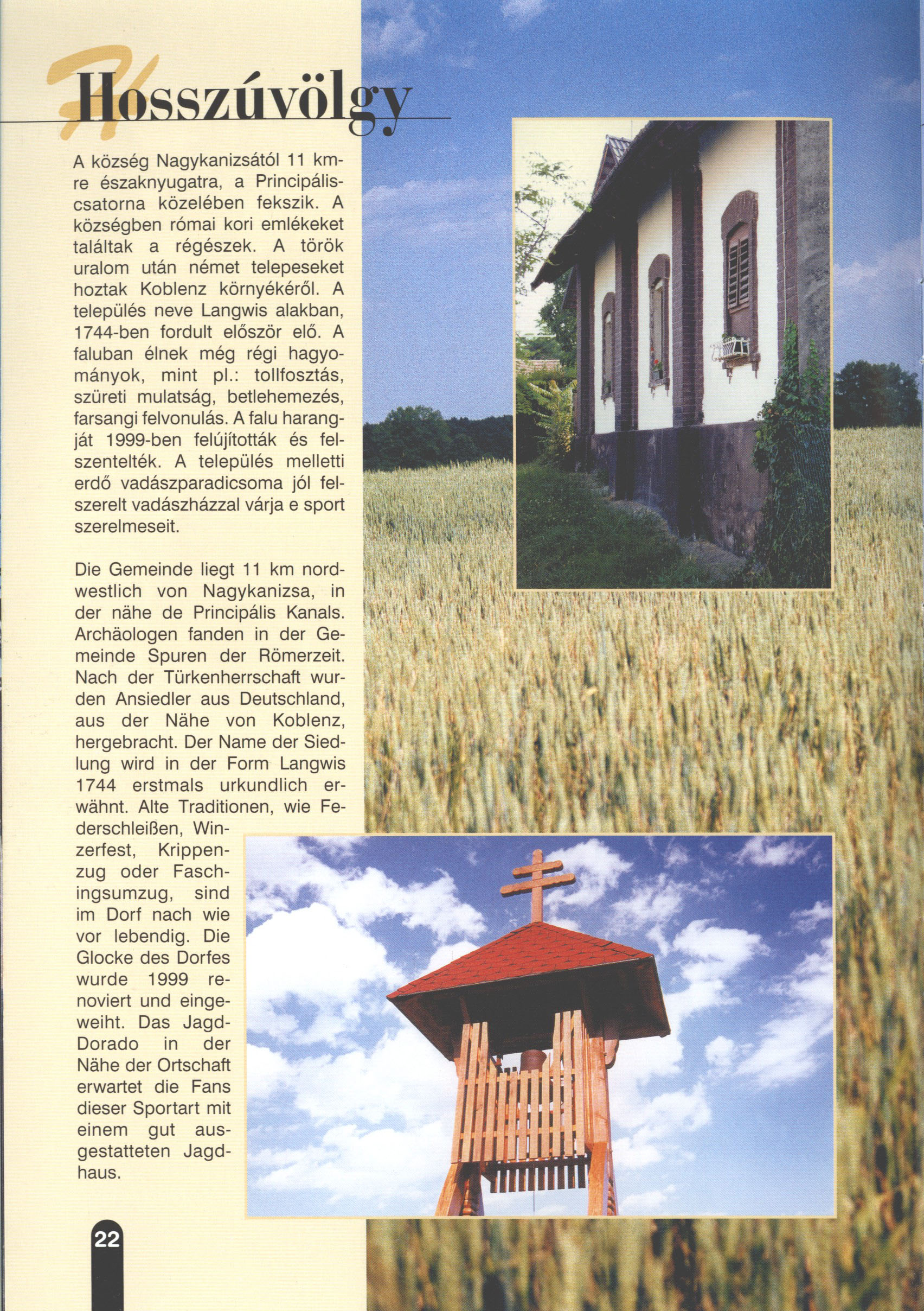 Nyilvános 2139 | 5657 | Hosszúvölgy | Die Gemeinde liegt 11 km nordwestlich von Nagykanizsa, in der nähe de Principális Kanals. Archäologen fanden in der Gemeinde Spuren der Römerzeit. Nach der Türkenherrschaft wurden Ansiedler aus Deutschland, aus der Nähe von Koblenz, hergebracht. Der Name der Siedlung wird in der Form Langwis 1744 erstmals urkundlich erwähnt. Alte Traditionen, wie Federschleißen, Winzerfest, Krippenzug oder Faschingsumzug, sind im Dorf nach wie vor lebendig. Die Glocke des Dorfes wurde 1999 renoviert und eingeweiht. Das Jagd-Dorado in der Nähe der Ortschaft erwartet die Fans dieser Sportart mit einem gut ausgestatteten Jagdhaus. Dieses Text stammt von: Titel: Hívogató a Régiók Kapujában - Útikönyv Látnivalók Nagykanizsán és Térségében (Einladend in dem Tor des Gebiets - Reisebuch - Sehenswürdigkeiten in Nagykanizsa und Umgebung) Herausgegeben von: Nagykanizsa és a Környező Települések Területfejlesztési Társulása (Verein für Gebietsentwicklung in Nagykanizsa und in ihrer Umgebung) 8800 Nagykanizsa, Petőfi Sándor út 5. Tel.: 06 93/536-453 • 06 93/536-454 Tel ./Fax: 06 93/326-323 E-mail: terstars@axelero.hu www.kanizsaterseg.celodin.hu |