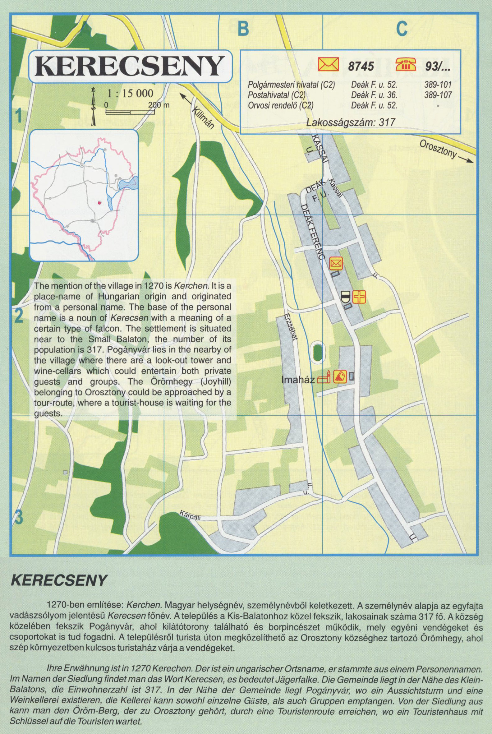 Nyilvános 2470 | 16182 | KERECSENY | 1270-ben említése: Kerchen. Magyar helységnév, személynévből keletkezett. A személynév alapja az egyfajta vadászsólyom jelentésű Kerecsen főnév. A település a Kis-Balatonhoz közel fekszik, lakosainak száma 317 fő. A község közelében fekszik Pogányvár, ahol kilátótorony található és borpincészet működik, mely egyéni vendégeket és csoportokat is tud fogadni. A településről turista úton megközelíthető az Orosztony községhez tartozó Örömhegy, ahol szép környezetben kulcsos turistaház várja a vendégeket. Ihre Erwähnung ist in 1270 Kerechen. Der ist ein ungarischer Ortsname, er stammte aus einem Personennamen. Im Namen der Siedlung findet man das Wort Kerecsen, es bedeutet Jägerfalke. Die Gemeinde liegt in der Nähe des Klein-Balatons, die Einwohnerzahl ist 317. In der Nähe der Gemeinde liegt Pogányvár, wo ein Aussichtsturm und eine Weinkellerei existieren, die Kellerei kann sowohl einzelne Gäste, als auch Gruppen empfangen. Von der Siedlung aus kann man den Öröm-Berg, der zu Orosztony gehört, durch eine Touristenroute erreichen, wo ein Touristenhaus mit Schlüssel auf die Touristen wartet. The mention of the village in 1270 is Kerchen. It is a place-name of Hungarian origin and originated from a personal name. The base of the personal name is a noun of Kerecsen with a meaning of a certain type of falcon. The settlement is situated near to the Small Balaton, the number of its population is 317. Pogányvár lies in the nearby of the village where there are a look-out tower and wine-cellars which could entertain both private guests and groups. The Örömhegy (Joyhill) belonging to Orosztony could be approached by a tour-route, where a tourist-house is waiting for the guests. A részlet a következő kiadványból származik/Die Teile stammen vom volgenden Buch/This text came from the following book: Cím/Titel/Title: Zala megye településeinek atlasza - 257 település részletes térképe/Atlas der Komitat Zala - 257 Detailte Siedlungskarten/Zala county\'s Atlas - 257 settlement maps. Közreműködő/contributor: Lackner László (1943) (fotó) Kiadás/Ausgabe/Publisher: Gyula : HISZI-MAP, 1997 Sorozat/Serie/Series: Indulástól - megérkezésig... ETO: 912(439.121-2) ; 908.439.121 Cutter: Z 19 ISBN: 963-610-025-4 Oldalszám/Seiten/Pages: 323, 81 p. Megjegyzés/Note: Lezárva/Abgeschlossen am/Closed am: 1997. máj. 30. |