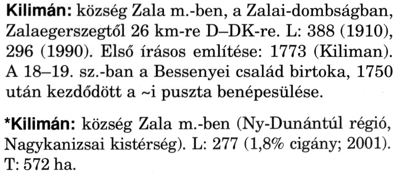 Nyilvános 2269 | 6129 | A szócikkek felismertetett szövege: | (A csillag után a kiegészítő kötetből származó szöveg következik) Kilimán: község Zala m.-ben, a Zalai-dombságban, Zalaegerszegtől 26 km-re D-DK-re. L: 388 (1910), 296 (1990). Első írásos említése: 1773 (Kiliman). A 18–19. sz.-ban a Bessenyei család birtoka, 1750 után kezdődött a ~i puszta benépesülése. *Kilimán: község Zala m.-ben (Ny-Dunántúl régió, Nagykanizsai kistérség). L: 277 (1,8% cigány; 2001). T: 572 ha. A szócikkek a következő lexikonból származnak: Cím: Magyar nagylexikon Közreműködő: Élesztős László (1949) (szerk.) ; Barabás Éva (1943) (szerk.) ; Berényi Gábor (1946) (szerk.) ; Bárány Lászlóné (szerk.) ; Adelmann-né Kertész Judit (1945) (közrem.) ; Froemel Károlyné Jáky Éva (1936) (közrem.) ; Akadémiai Kiadó és Nyomda Vállala Szerz. közl.: [... Élesztős László főszerk.] ; [szerk. Barabás Éva et al.] ; [bibliogr. Adelmanné Kertész Judit] ; [kész. az Akadémiai Kiadó Magyar Nagylexikon Szerkesztőségében] Kiadás: Budapest : Akad. K., 1993- Kötetei: 1. köt., A - Anc 2. köt., And - Bag 3. köt., Bah - Bij 4. köt., Bik - Bz 5. köt., C - Csem 6. köt., Csen - Ec 7. köt., Ed - Fe 8. köt., Ff - Gyep 9. köt., Gyer - Iq 10. köt., Ir - Kip 11. köt., Kir - Lem 12. köt., Len - Mep 13. köt., Mer - Nyk 14. köt., Nyl - Pom 15. köt., Pon - Sek 16. köt., Sel - Szö 17. köt., Szp - Ung 18. köt., Unh - Z 19. köt., Kiegészítő kötet, A - Z ETO jelzet: 030=945.11 Szakjelzet: 030 Cutter: M 14 ISBN: 963-05-6611-7 [!ISBN 963-05-6615-X] Nyelv: magyar Megjegyzés: Az 5. kötettől kiad. a Magyar Nagylexikon Kiadó ; A 6. kötettől főszerk. Berényi Gábor ; A 6. kötettől szakszerk. Bárány Lászlóné et al. ; A 6. kötettől bibliogr. Froemel Károlyné ; Bibliogr. a szócikkek végén |