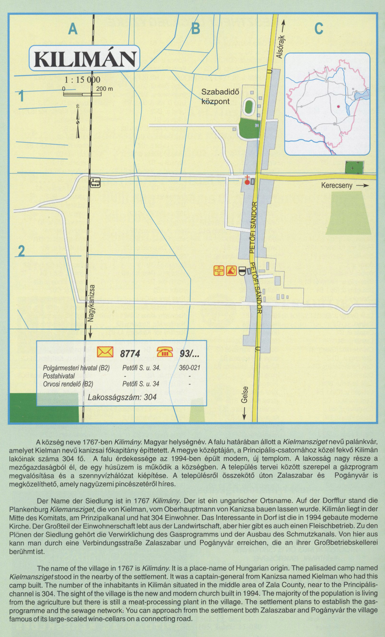 Nyilvános 2395 | 9419 | KILIMÁN | A község neve 1767-ben Kilimány. Magyar helységnév. A falu határában állott a Kielmansziget nevű palánkvár, amelyet Kielman nevű kanizsai főkapitány építtetett. A megye középtáján, a Principális-csatornához közel fekvő Kilimán lakóinak száma 304 fő. A falu érdekessége az 1994-ben épült modern, új templom. A lakosság nagy része a mezőgazdaságból él, de egy húsüzem is működik a községben. A település tervei között szerepel a gázprogram megvalósítása és a szennyvízhálózat kiépítése. A településről összekötő úton Zalaszabar és Pogányvár is megközelíthető, amely nagyüzemi pincészetéről híres. Der Name der Siedlung ist in 1767 Kilimány. Der ist ein ungarischer Ortsname. Auf der Dorfflur stand die Plankenburg Kilemansziget, die von Kielman, vom Oberhauptmann von Kanizsa bauen lassen wurde. Kilimán liegt in der Mitte des Komitats, am Prinzipalkanal und hat 304 Einwohner. Das Interessante in Dorf ist die in 1994 gebaute moderne Kirche. Der Großteil der Einwohnerschaft lebt aus der Landwirtschaft, aber hier gibt es auch einen Fleischbetrieb. Zu den Plänen der Siedlung gehört die Verwirklichung des Gasprogramms und der Ausbau des Schmutzkanals. Von hier aus kann man durch eine Verbindungsstraße Zalaszabar und Pogányvár erreichen, die an ihrer Großbetriebskellerei berühmt ist. The name of the village in 1767 is Kilimány. It is a place-name of Hungarian origin. The palisaded camp named Kielmansziget stood in the nearby of the settlement. It was a captain-general from Kanizsa named Kielman who had this camp built. The number of the inhabitants in Kilimán situated in the middle area of Zala County, near to the Principális-channel is 304. The sight of the village is the new and modern church built in 1994. The majority of the population is living from the agriculture but there is still a meat-processing plant in the village. The settlement plans to establish the gas-programme and the sewage network; You can approach from the settlement both Zalaszabar and Pogányvár the village famous of its large-scaled wine-cellars on a connecting road. A részlet a következő kiadványból származik/Die Teile stammen vom volgenden Buch/This text came from the following book: Cím/Titel/Title: Zala megye településeinek atlasza - 257 település részletes térképe/Atlas der Komitat Zala - 257 Detailte Siedlungskarten/Zala county\'s Atlas - 257 settlement maps. Közreműködő/contributor: Lackner László (1943) (fotó) Kiadás/Ausgabe/Publisher: Gyula : HISZI-MAP, 1997 Sorozat/Serie/Series: Indulástól - megérkezésig... ETO: 912(439.121-2) ; 908.439.121 Cutter: Z 19 ISBN: 963-610-025-4 Oldalszám/Seiten/Pages: 323, 81 p. Megjegyzés/Note: Lezárva/Abgeschlossen am/Closed am: 1997. máj. 30. |
