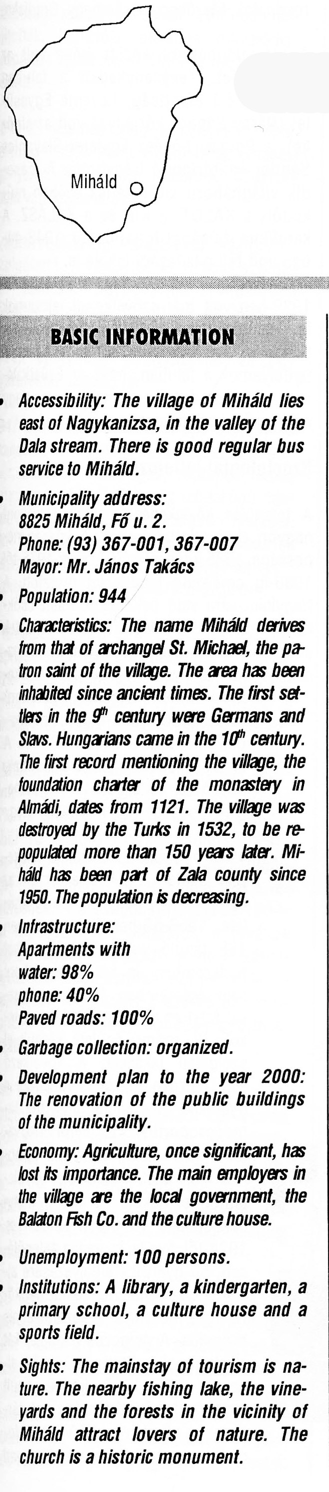 Nyilvános 2300 | 6066 | Miháld | BASIC INFORMATION Accessibility: The village of Miháld lies east of Nagykanizsa, in the valley of the Dola stream. There is good regular bus service to Miháld. Municipality address: 8825 Miháld, Fő u. 2. Phone: (93) 367-001, 367-007 Mayor: Mr. János Takács Population: 944 Characteristics: The name Miháld derives from that of archangel St. Michael, the patron saint of the village. The area has been inhabited since ancient times. The first settlers in the 9th century were Germans and Slavs. Hungarians came in the 10th century. The first record mentioning the village, the foundation charter of the monastery in Almádi, dates from 1121. The village was destroyed by the Turks in 1532, to be repopulated more than 150 years later. Miháld has been part of Zala county since 1950. The population is decreasing. Infrastructure: Apartments with water: 98% phone: 40% Paved roads: 100% Garbage collection: organized. Development plan to the year 2000: The renovation of the public buildings of the municipality. Economy: Agriculture, once significant, has lost its importance. The main employers in the village are the local government, the Balaton Fish Co. and the culture house. Unemployment: 100 persons. Institutions: A library, a kindergarten, a primary school, a culture house and a sports field. Sights: The mainstay of tourism is nature. The nearby fishing lake, the vineyards and the forests in the vicinity of Miháld attract lovers of nature. The church is a historic monument. This text came from the following book: Title: Handbook of Zala county (Zala megye kézikönyve) Series: County handbooks of Hungary (Magyarország megyei kézikönyvei) Chief editor: Hóbor József Publisher: (Hatvan), CEBA-Hungary Ltd, 1998 ETO: 908.439.121(035) ; 050.8(439.121) ISBN: 963-9089-18-2 Pages: 488-1040 p. Remark: Closed on: 1998. márc. 31. |