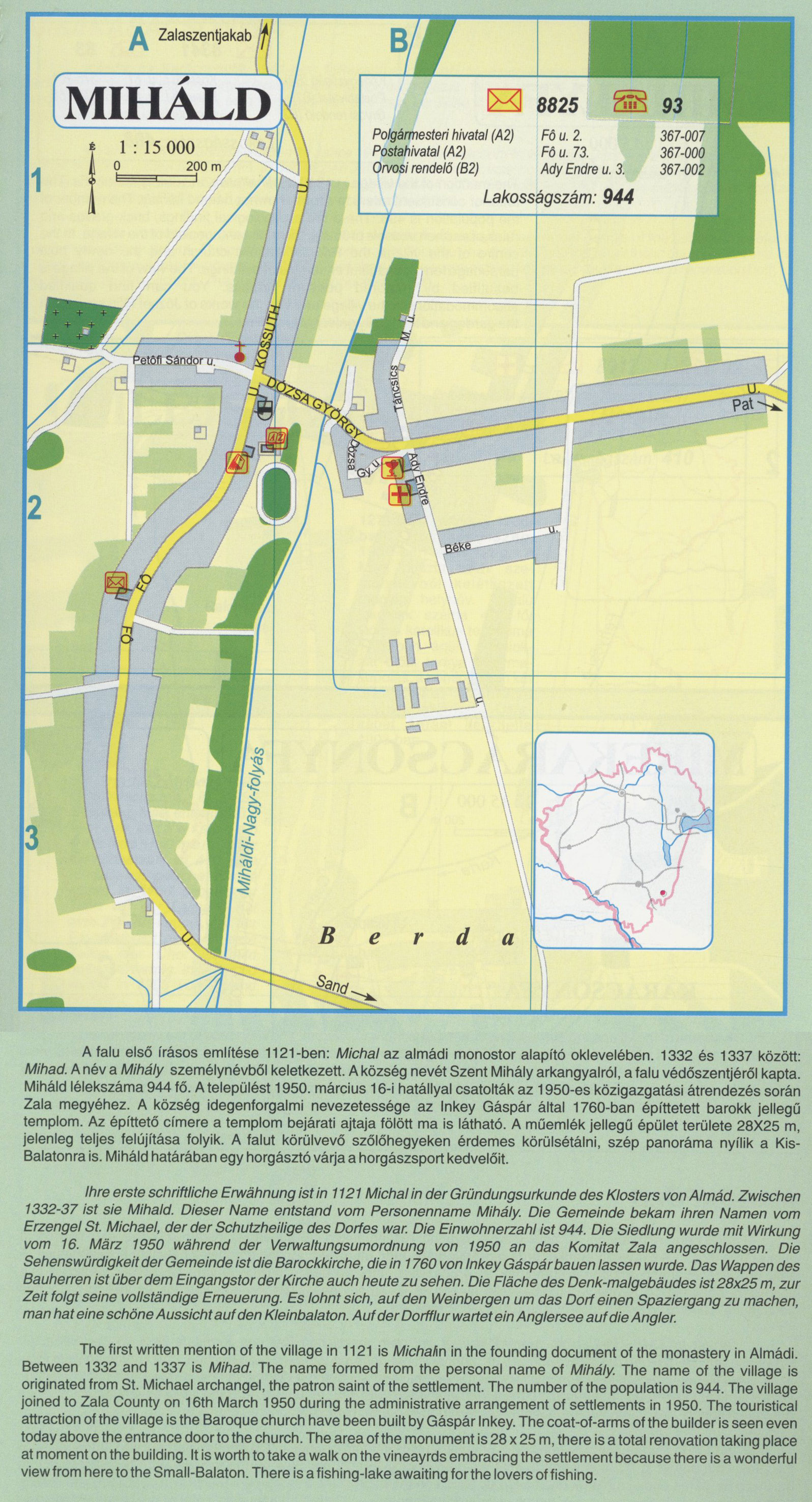 Nyilvános 2357 | 8449 | MIHÁLD | A falu első írásos említése 1121-ben: Michal az almádi monostor alapító oklevelében. 1332 és 1337 között: Mihad. A név a Mihály személynévből keletkezett. A község nevét Szent Mihály arkangyalról, a falu védőszentjéről kapta. Miháld lélekszáma 944 fő. A települést 1950. március 16-i hatállyal csatolták az 1950-es közigazgatási átrendezés során Zala megyéhez. A község idegenforgalmi nevezetessége az Inkey Gáspár által 1760-ban építtetett barokk jellegű templom. Az építtető címere a templom bejárati ajtaja fölött ma is látható. A műemlék jellegű épület területe 28X25 m, jelenleg teljes felújítása folyik. A falut körülvevő szőlőhegyeken érdemes körülsétálni, szép panoráma nyílik a Kis-Balatonra is. Miháld határában egy horgásztó várja a horgászsport kedvelőit. Ihre erste schriftliche Erwähnung ist in 1121 Michal in der Gründungsurkunde des Klosters von Almád. Zwischen 1332-37 ist sie Mihald. Dieser Name entstand vom Personenname Mihály. Die Gemeinde bekam ihren Namen vom Erzengel St. Michael, der der Schutzheilige des Dorfes war. Die Einwohnerzahl ist 944. Die Siedlung wurde mit Wirkung vom 16. März 1950 während der Verwaltungsumordnung von 1950 an das Komitat Zala angeschlossen. Die Sehenswürdigkeit der Gemeinde ist die Barockkirche, die in 1760 von Inkey Gáspár bauen lassen wurde. Das Wappen des Bauherren ist über dem Eingangstor der Kirche auch heute zu sehen. Die Fläche des Denk-malgebäudes ist 28x25 m, zur Zeit folgt seine vollständige Erneuerung. Es lohnt sich, auf den Weinbergen um das Dorf einen Spaziergang zu machen, man hat eine schöne Aussicht auf den Kleinbalaton. Auf der Dorfflur wartet ein Anglersee auf die Angler. The first written mention of the village in 1121 is Michalin in the founding document of the monastery in Almádi. Between 1332 and 1337 is Mihad. The name formed from the personal name of Mihály. The name of the village is originated from St. Michael archangel, the patron saint of the settlement. The number of the population is 944. The village joined to Zala County on 16th March 1950 during the administrative arrangement of settlements in 1950. The touristical attraction of the village is the Baroque church have been built by Gáspár Inkey. The coat-of-arms of the builder is seen even today above the entrance door to the church. The area of the monument is 28 x 25 m, there is a total renovation taking place at moment on the building. It is worth to take a walk on the vineayrds embracing the settlement because there is a wonderful view from here to the Small-Balaton. There is a fishing-lake awaiting for the lovers of fishing. A részlet a következő kiadványból származik/Die Teile stammen vom volgenden Buch/This text came from the following book: Cím/Titel/Title: Zala megye településeinek atlasza - 257 település részletes térképe/Atlas der Komitat Zala - 257 Detailte Siedlungskarten/Zala county\'s Atlas - 257 settlement maps. Közreműködő/contributor: Lackner László (1943) (fotó) Kiadás/Ausgabe/Publisher: Gyula : HISZI-MAP, 1997 Sorozat/Serie/Series: Indulástól - megérkezésig... ETO: 912(439.121-2) ; 908.439.121 Cutter: Z 19 ISBN: 963-610-025-4 Oldalszám/Seiten/Pages: 323, 81 p. Megjegyzés/Note: Lezárva/Abgeschlossen am/Closed am: 1997. máj. 30. |