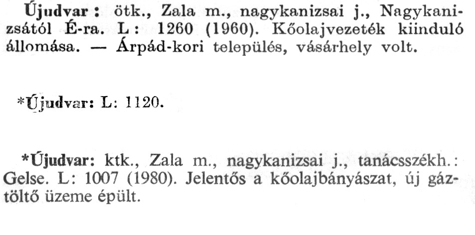Nyilvános 2577 | 6551 | A szócikkek felismertetett szövege: | (Az első csillag után az 1972-es, a második csillag után az 1981-es kiadású kiegészítő kötetből származó szöveg következik) Újudvar: ötk., Zala m., nagykanizsai j., Nagykanizsától É-ra. L: 1260 (1960). Kőolajvezeték kiinduló állomása. – Árpád-kori település, vásárhely volt. *Újudvar: L: 1120. *Újudvar: ktk., Zala m., nagykanizsai j., tanácsszékh.: Gelse. L: 1007 (1980). Jelentős a kőolajbányászat, új gáztöltő üzeme épült. A szócikkek a következő lexikonból származnak: Cím: Új magyar lexikon Közreműködő: Berei Andor (1900-1979) (szerk.) Szerz. közl.: [szerk. Berei Andor et al.] Kiadás jelzés: 2. lny. Kiadás: Budapest : Akad. K., 1961-1962 Kötetei: 1., A - C 2., D - F 3., G - J 4., K - Me 5., Mf - R 6., S - Z 7. köt., A-Z Kiegészítő kötet (1972) Kiegészítő kötet, 1962÷1980 (1981) ETO jelzet: 03=945.11 Szakjelzet: 030 Cutter: U 28 Nyelv: magyar Megjegyzés: Bibliogr. a címszavak egy részének végén |