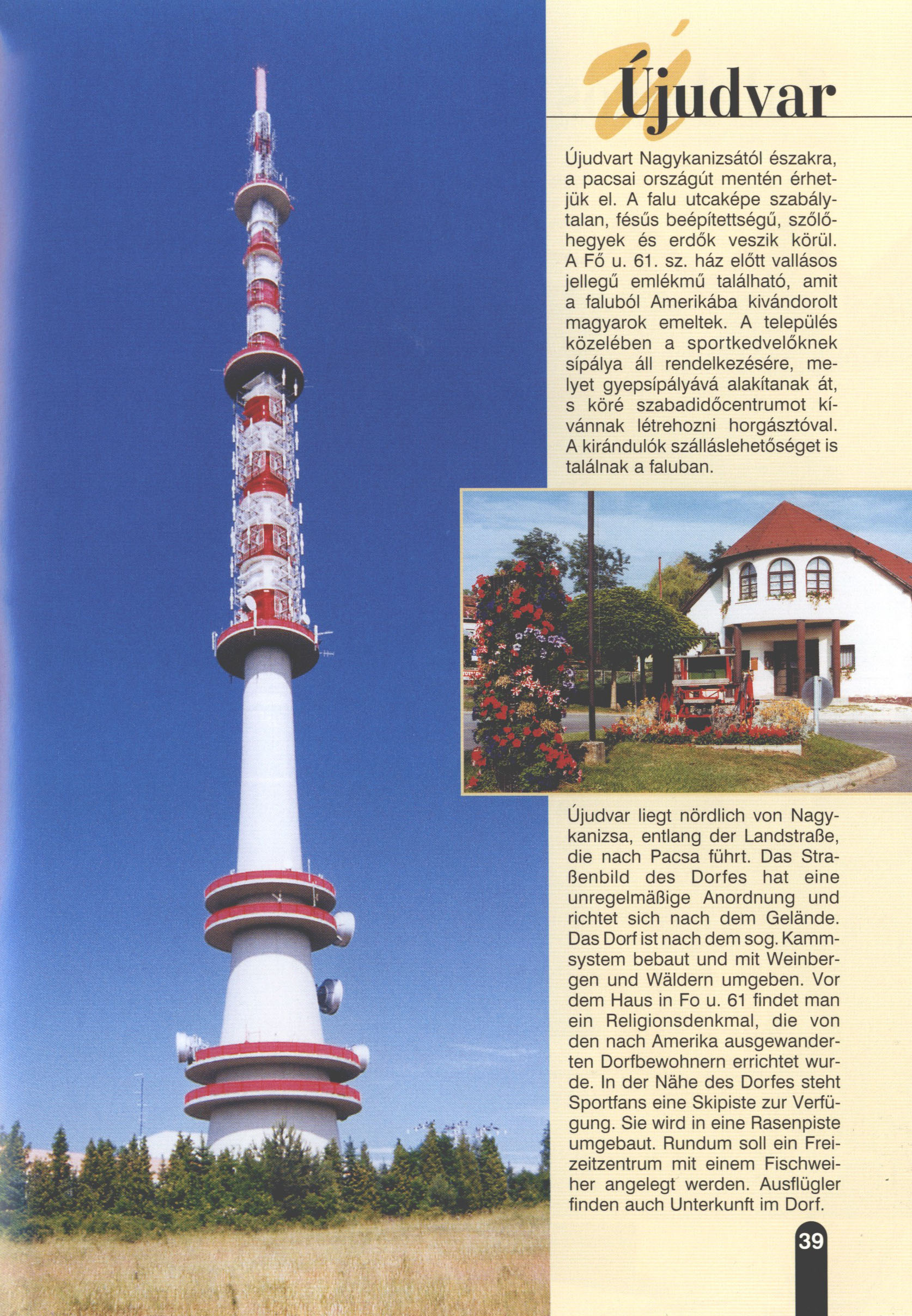 Nyilvános 2677 | 6770 | Újudvar | Újudvar liegt nördlich von Nagykanizsa, entlang der Landstraße, die nach Pacsa führt. Das Straßenbild des Dorfes hat eine unregelmäßige Anordnung und richtet sich nach dem Gelände. Das Dorf ist nach dem sog. Kammsystem bebaut und mit Weinbergen und Wäldern umgeben. Vor dem Haus in Fo u. 61 findet man ein Religionsdenkmal, die von den nach Amerika ausgewanderten Dorfbewohnern errichtet wurde. In der Nähe des Dorfes steht Sportfans eine Skipiste zur Verfügung. Sie wird in eine Rasenpiste umgebaut. Rundum soll ein Freizeitzentrum mit einem Fischweiher angelegt werden. Ausflügler finden auch Unterkunft im Dorf. Dieses Text stammt von: Titel: Hívogató a Régiók Kapujában - Útikönyv Látnivalók Nagykanizsán és Térségében (Einladend in dem Tor des Gebiets - Reisebuch - Sehenswürdigkeiten in Nagykanizsa und Umgebung) Herausgegeben von: Nagykanizsa és a Környező Települések Területfejlesztési Társulása (Verein für Gebietsentwicklung in Nagykanizsa und in ihrer Umgebung) 8800 Nagykanizsa, Petőfi Sándor út 5. Tel.: 06 93/536-453 • 06 93/536-454 Tel ./Fax: 06 93/326-323 E-mail: terstars@axelero.hu www.kanizsaterseg.celodin.hu |