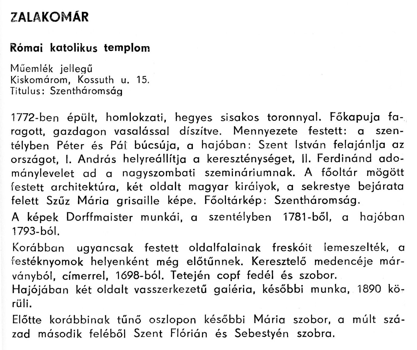 Nyilvános 1893 | 5017 | Zalakomár - Zala megye műemlékei 1979 117old | A részlet szövege: ZALAKOMÁR Római katolikus templom Műemlék jellegű Kiskomárom, Kossuth u. 15. Titulus: Szentháromság 1772-ben épült, homlokzati, hegyes sisakos toronnyal. Főkapuja faragott, gazdagon vasalással díszítve. Mennyezete festett: a szentélyben Péter és Pál búcsúja, a hajóban: Szent István felajánlja az országot, I. András helyreállítja a kereszténységet, II. Ferdinánd adománylevelet ad a nagyszombati szemináriumnak. A főoltár mögött festett architektúra, két oldalt magyar királyok, a sekrestye bejárata felett Szűz Mária grisaille képe. Főoltárkép: Szentháromság. A képek Dorffmaister munkái, a szentélyben 1781-ből, a hajóban 1793-ból. Korábban ugyancsak festett oldalfalainak freskóit lemeszelték, a festéknyomok helyenként még előtűnnek. Keresztelő medencéje márványból, címerrel, 1698-ból. Tetején copf fedél és szobor. Hajójában két oldalt vasszerkezetű galéria, későbbi munka, 1890 körüli. Előtte korábbinak tűnő oszlopon későbbi Mária szobor, a múlt század második feléből Szent Flórián és Sebestyén szobra. A részlet a következő könyvből származik: Cím: Zala megye műemlékei Szerző: Németh József (1928) Közreműködő: Vándor László (szerk.) ; Szabóky Zsolt (1941) (fotó) Szerz. közl.: Németh József ; [szerk. Vándor László] ; [fotók... Szabóky Zsolt] Kiadás jelzés: 2. bőv. kiad. Kiadás: Zalaegerszeg : Zalai Ny., 1979 ETO jelzet: 72(439.121) ; 7.025.3/.4(439.121) ; 908.439.121 Tárgyszó: Zala Szakjelzet: 908 Cutter: N 53 Nyelv: magyar Oldalszám: 134 p. |