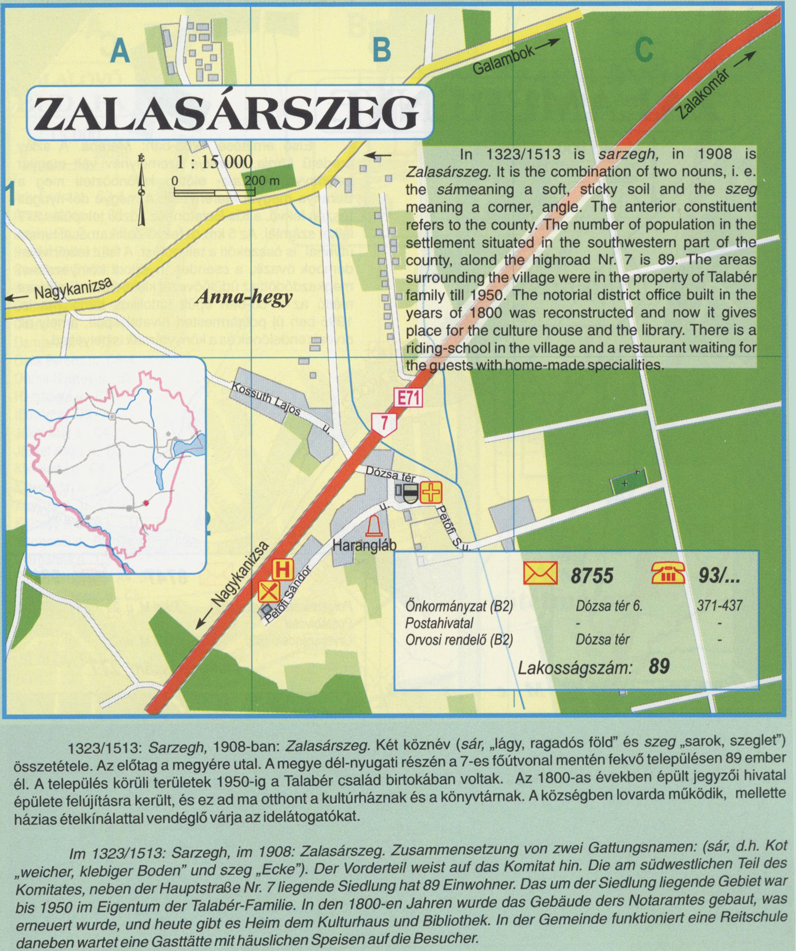 Nyilvános 2380 | 8884 | ZALASÁRSZEG | 1323/1513: Sarzegh, 1908-ban: Zalasárszeg. Két köznév (sár, „lágy, ragadós föld" és szeg „sarok, szeglet") összetétele. Az előtag a megyére utal. A megye dél-nyugati részén a 7-es főútvonal mentén fekvő településen 89 ember él. A település körüli területek 1950-ig a Talabér család birtokában voltak. Az 1800-as években épült jegyzői hivatal épülete felújításra került, és ez ad ma otthont a kultúrháznak és a könyvtárnak. A községben lovarda működik, mellette házias ételkínálattal vendéglő várja az idelátogatókat. lm 1323/1513: Sarzegh, im 1908: Zalasárszeg. Zusammensetzung von zwei Gattungsnamen: (sár, d.h. Kot „weicher, klebiger Boden" und szeg „Ecke"). Der Vorderteil weist auf das Komitat hin. Die am südwestlichen Teil des Komitates, neben der Hauptstraße Nr. 7 liegende Siedlung hat 89 Einwohner. Das um der Siedlung liegende Gebiet war bis 1950 im Eigentum der Talabér-Familie. In den 1800-en Jahren wurde das Gebäude ders Notaramtes gebaut, was erneuert wurde, und heute gibt es Heim dem Kulturhaus und Bibliothek. In der Gemeinde funktioniert eine Reitschule daneben wartet eine Gasttätte mit häuslichen Speisen auf die Besucher. In 1323/1513 is sarzegh, in 1908 is, Zalasárszeg. It is the combination of two nouns, i. e. the sármeaning a soft, sticky soil and the szeg meaning a corner, angle. The anterior constituent refers to the county. The number of population in the settlement situated in the southwestern part of the county, alond the highroad Nr. 7 is 89. The areas surrounding the village were in the property of Talabér family till 1950. The notorial district office built in the years of 1800 was reconstructed and now it gives place for the culture house and the library. There is a riding-school in the village and a restaurant waiting for the guests, with home-made specialities. A részlet a következő kiadványból származik/Die Teile stammen vom volgenden Buch/This text came from the following book: Cím/Titel/Title: Zala megye településeinek atlasza - 257 település részletes térképe/Atlas der Komitat Zala - 257 Detailte Siedlungskarten/Zala county\'s Atlas - 257 settlement maps. Közreműködő/contributor: Lackner László (1943) (fotó) Kiadás/Ausgabe/Publisher: Gyula : HISZI-MAP, 1997 Sorozat/Serie/Series: Indulástól - megérkezésig... ETO: 912(439.121-2) ; 908.439.121 Cutter: Z 19 ISBN: 963-610-025-4 Oldalszám/Seiten/Pages: 323, 81 p. Megjegyzés/Note: Lezárva/Abgeschlossen am/Closed am: 1997. máj. 30. |
