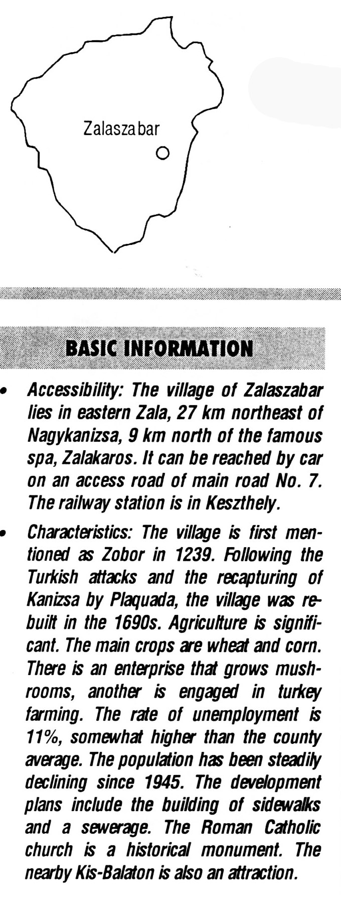 Nyilvános 2378 | 7980 | Zalaszabar | BASIC INFORMATION Accessibility: The village of Zalaszabar lies in eastern Zala, 27 km northeast of Nagykanizsa, 9 km north of the famous spa, Zalakaros. It can be reached by car on an access road of main road No. 7. The railway station is in Keszthely. Characteristics: The village is first mentioned as Zobor in 1239. Following the Turkish attacks and the recapturing of Kanizsa by Plaquada, the village was rebuilt in the 1690s. Agriculture is significant. The main crops are wheat and corn. There is an enterprise that grows mushrooms, another is engaged in turkey farming. The rate of unemployment is 11%, somewhat higher than the county average. The population has been steadily declining since 1945. The development plans include the building of sidewalks and a sewerage. The Roman Catholic church is a historical monument. The nearby Kis-Balaton is also an attraction. This text came from the following book: Title: Handbook of Zala county (Zala megye kézikönyve) Series: County handbooks of Hungary (Magyarország megyei kézikönyvei) Chief editor: Hóbor József Publisher: (Hatvan), CEBA-Hungary Ltd, 1998 ETO: 908.439.121(035) ; 050.8(439.121) ISBN: 963-9089-18-2 Pages: 488-1040 p. Remark: Closed on: 1998. márc. 31. |