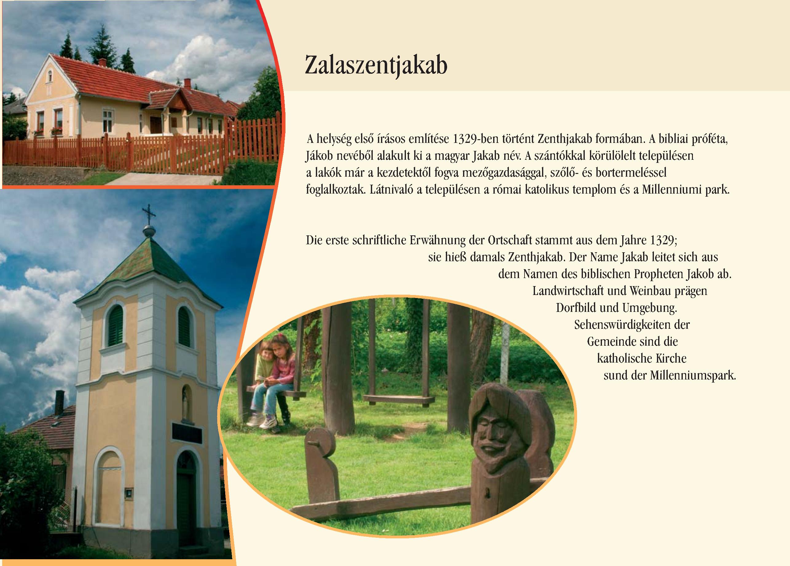 Nyilvános 2027 | 5924 | Zalaszentjakab | Die erste schriftliche Erwähnung der Ortschaft stammt aus dem Jahre 1329; sie hieß damals Zenthjakab. Der Name Jakab leitet sich aus dem Namen des biblischen Propheten Jakob ab. Landwirtschaft und Weinbau prägen Dorfbild und Umgebung. Sehenswürdigkeiten der Gemeinde sind die katholische Kirche sund der Millenniumspark. Dieses Text stammt von: Pannonhát tájpark prospektus 2006. Web: http://www.pannonhat.hu/ (auch in Deutsch) |