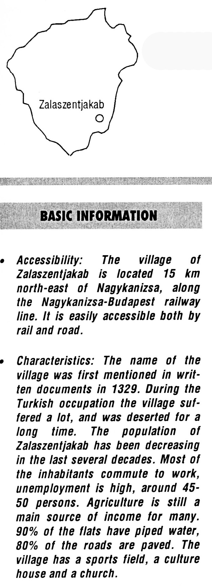 Nyilvános 1982 | 5608 | Zalaszentjakab | BASIC INFORMATION Accessibility: The village of Zalaszentjakab is located 15 km north-east of Nagykanizsa, along the Nagykanizsa-Budapest railway line. It is easily accessible both by rail and road. Characteristics: The name of the village was first mentioned in written documents in 1329. During the Turkish occupation the village suffered a lot, and was deserted for a long time. The population of Zalaszentjakab has been decreasing in the last several decades. Most of the inhabitants commute to work, unemployment is high, around 45-50 persons. Agriculture is still a main source of income for many. 90% of the flats have piped water, 80% of the roads are paved. The village has a sports field, a culture house and a church. This text came from the following book: Title: Handbook of Zala county (Zala megye kézikönyve) Series: County handbooks of Hungary (Magyarország megyei kézikönyvei) Chief editor: Hóbor József Publisher: (Hatvan), CEBA-Hungary Ltd, 1998 ETO: 908.439.121(035) ; 050.8(439.121) ISBN: 963-9089-18-2 Pages: 488-1040 p. Remark: Closed on: 1998. márc. 31. |