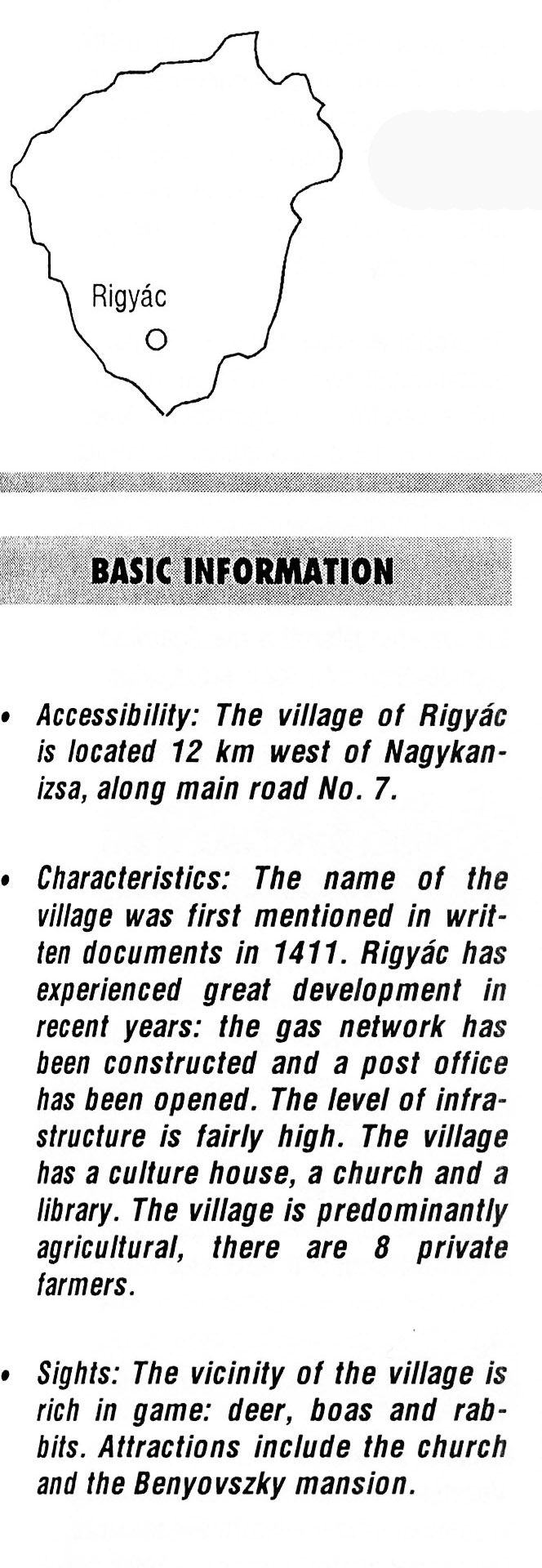 Nyilvános 2311 | 5957 | Rigyác | BASIC INFORMATION Accessibility. The village of Rigyác is located 12 km west of Nagykanizsa, along main road No. 7. Characteristics: The name of the village was first mentioned in written documents in 1411. Rigyác has experienced great development in recent years: the gas network has been constructed and a post office has been opened. The level of infrastructure is fairly high. The village has a culture house, a church and a library. The village is predominantly agricultural, there are 8 private farmers. Sights: The vicinity of the village is rich in game: deer, boas and rabbits. Attractions include the church and the Benyovszky mansion. This text came from the following book: Title: Handbook of Zala county (Zala megye kézikönyve) Series: County handbooks of Hungary (Magyarország megyei kézikönyvei) Chief editor: Hóbor József Publisher: (Hatvan), CEBA-Hungary Ltd, 1998 ETO: 908.439.121(035) ; 050.8(439.121) ISBN: 963-9089-18-2 Pages: 488-1040 p. Remark: Closed on: 1998. márc. 31. |