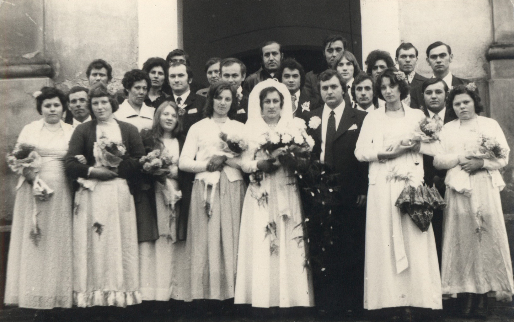 Nyilvános 1694 | 5189 | 1980-85. Kiskomáromi templom előtt. Baranyai József és Horváth Márta esküvője. Első sor: Baranyai Józseftől jobbra: Tarsoly Erika, Horváth István, Barsó Ferencné. Menyasszonytól balra: 3. Paprika Erzsébet, Muszka Lászlóné. | Második sor: 1. Horváth Jenő, Tarsoly Istvánné ... menyasszony mögött jobbra Horváth józsef. Harmadik sor: Jobbról balra: Szőke József, Horváth Ferenc, valamilyen Józsefné, 5. hátul Csizmadia József 6. Baranyai Gyula |