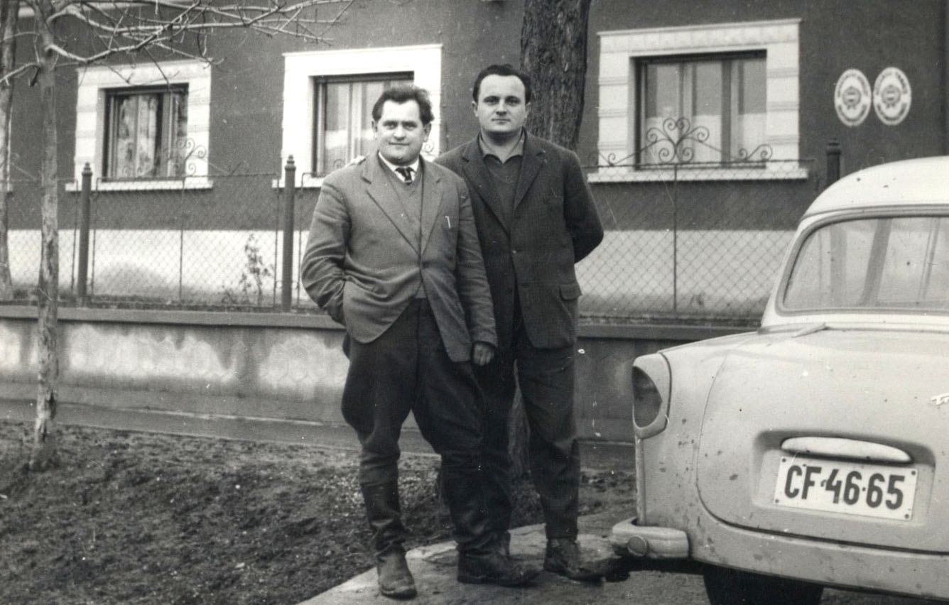 Beszélgető férfiak a balatonmagyaródi tanácsház előtt. Kovács Ferencné gyűjteményéből az 1960-as évekből.