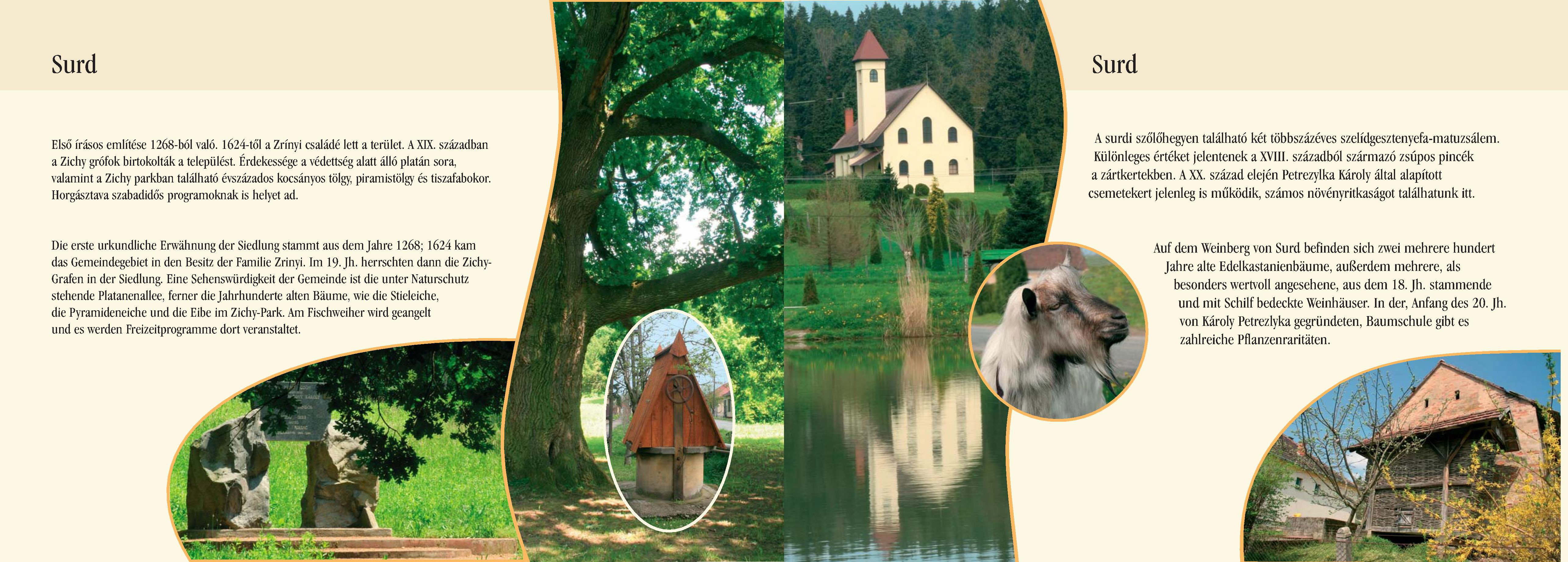 Nyilvános 2572 | 8508 | Surd | Die erste urkundliche Erwähnung der Siedlung stammt aus dem Jahre 1268; 1624 kam das Gemeindegebiet in den Besitz der Familie Zrinyi. Im 19. Jh. herrschten dann die Zichy-Grafen in der Siedlung. Eine Sehenswürdigkeit der Gemeinde ist die unter Naturschutz stehende Platanenallee, ferner die Jahrhunderte alten Bäume, wie die Stieleiche, die Pyramideneiche und die Eibe im Zichy-Park. Am Fischweiher wird geangelt und es werden Freizeitprogramme dort veranstaltet. Auf dem Weinberg von Surd befinden sich zwei mehrere hundert Jahre alte Edelkastanienbäume, außerdem mehrere, als besonders wertvoll angesehene, aus dem 18. Jh. stammende und mit Schilf bedeckte Weinhäuser. In der, Anfang des 20. Jh. von Károly Petrezlyka gegründeten, Baumschule gibt es zahlreiche Pflanzenraritäten. Dieses Text stammt von: Pannonhát tájpark prospektus 2006. Web: http://www.pannonhat.hu/ (auch in Deutsch |