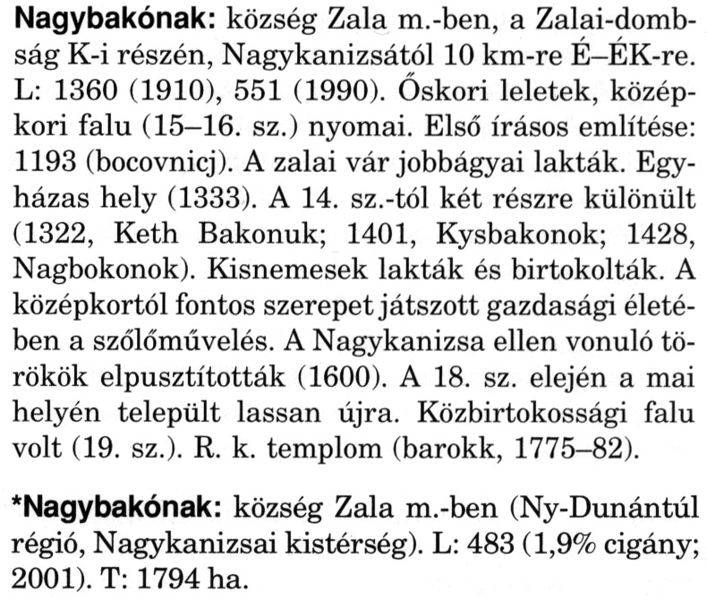Nyilvános 2522 | 7362 | A szócikkek felismertetett szövege: | (A csillag után a kiegészítő kötetből származó szöveg következik) Nagybakónak: község Zala m.-ben, a Zalai-dombság K-i részén, Nagykanizsától 10 km-re É-ÉK-re. L: 1360 (1910), 551 (1990). Őskori leletek, középkori falu (15—16. sz.) nyomai. Első írásos említése: 1193 (bocovnicj). A zalai vár jobbágyai lakták. Egy-házas hely (1333). A 14. sz.-tól két részre különült (1322, Keth Bakonuk; 1401, Kysbakonok; 1428, Nagbokonok). Kisnemesek lakták és birtokolták. A középkortól fontos szerepet játszott gazdasági életében a szőlőművelés. A Nagykanizsa ellen vonuló törökök elpusztították (1600). A 18. sz. elején a mai helyén települt lassan újra. Közbirtokossági falu volt (19. sz.). R. k. templom (barokk, 1775-82). *Nagybakónak: község Zala m.-ben (Ny-Dunántúl régió, Nagykanizsai kistérség). L: 483 (1,9% cigány; 2001). T: 1794 ha. A szócikkek a következő lexikonból származnak: Cím: Magyar nagylexikon Közreműködő: Élesztős László (1949) (szerk.) ; Barabás Éva (1943) (szerk.) ; Berényi Gábor (1946) (szerk.) ; Bárány Lászlóné (szerk.) ; Adelmann-né Kertész Judit (1945) (közrem.) ; Froemel Károlyné Jáky Éva (1936) (közrem.) ; Akadémiai Kiadó és Nyomda Vállala Szerz. közl.: [... Élesztős László főszerk.] ; [szerk. Barabás Éva et al.] ; [bibliogr. Adelmanné Kertész Judit] ; [kész. az Akadémiai Kiadó Magyar Nagylexikon Szerkesztőségében] Kiadás: Budapest : Akad. K., 1993- Kötetei: 1. köt., A - Anc 2. köt., And - Bag 3. köt., Bah - Bij 4. köt., Bik - Bz 5. köt., C - Csem 6. köt., Csen - Ec 7. köt., Ed - Fe 8. köt., Ff - Gyep 9. köt., Gyer - Iq 10. köt., Ir - Kip 11. köt., Kir - Lem 12. köt., Len - Mep 13. köt., Mer - Nyk 14. köt., Nyl - Pom 15. köt., Pon - Sek 16. köt., Sel - Szö 17. köt., Szp - Ung 18. köt., Unh - Z 19. köt., Kiegészítő kötet, A - Z ETO jelzet: 030=945.11 Szakjelzet: 030 Cutter: M 14 ISBN: 963-05-6611-7 [!ISBN 963-05-6615-X] Nyelv: magyar Megjegyzés: Az 5. kötettől kiad. a Magyar Nagylexikon Kiadó ; A 6. kötettől főszerk. Berényi Gábor ; A 6. kötettől szakszerk. Bárány Lászlóné et al. ; A 6. kötettől bibliogr. Froemel Károlyné ; Bibliogr. a szócikkek végén |