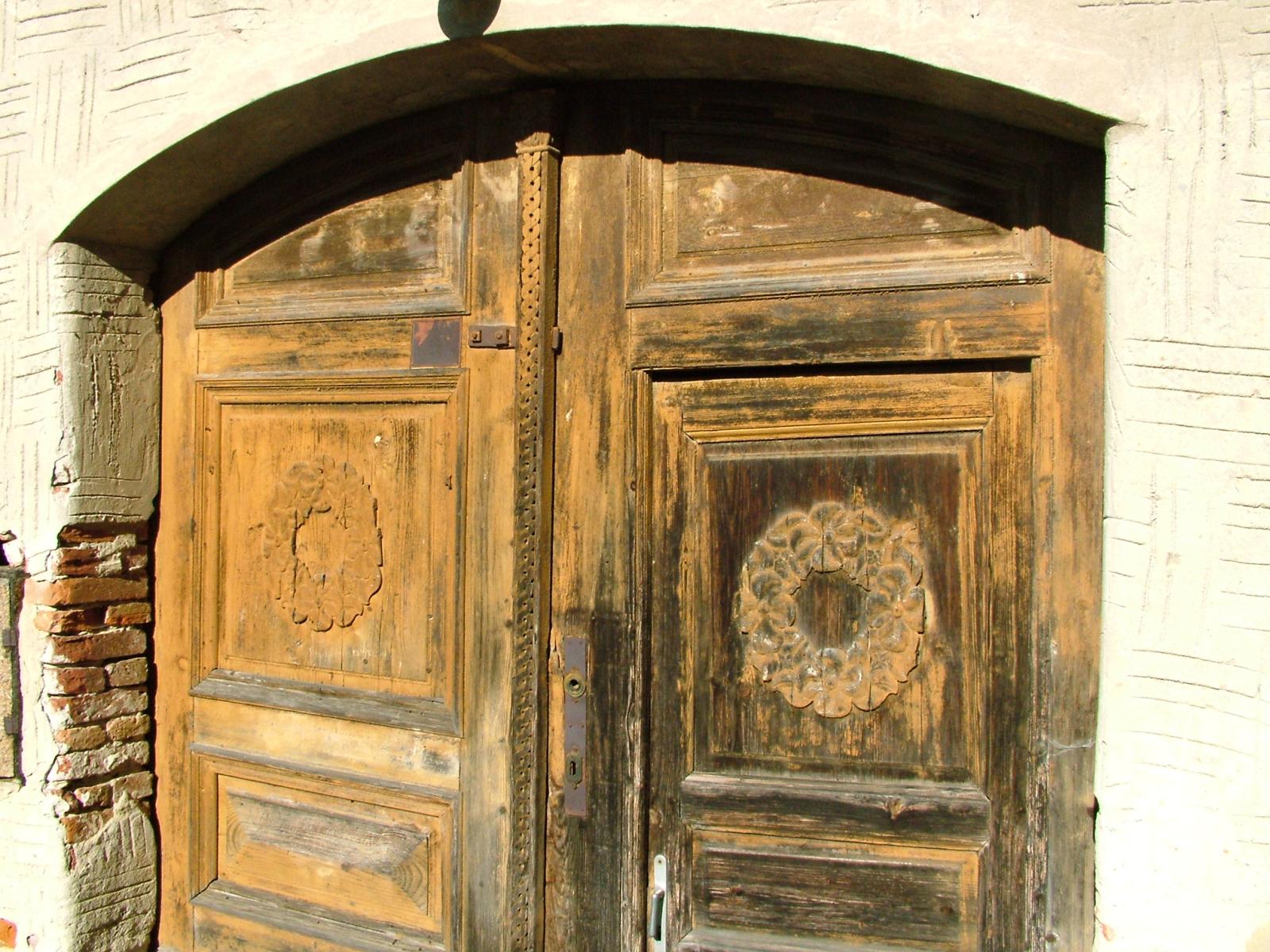 Szent István király plébániatemplom melletti valamikori tanítólakás szépen faragott rosettás kapuja.