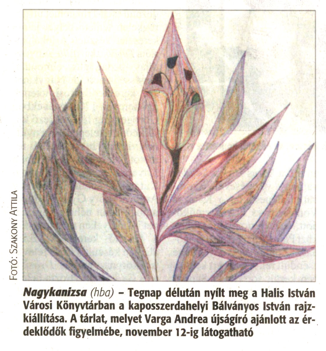 Nyilvános 1396 | 3484 | Zalai Hírlap 2008 11 03 256sz 16old - Bálványos István kiállítás | A cikk szövege: Nagykanizsa (hba) - Tegnap délután nyílt meg a Halis István Városi Könyvtárban a kaposszerdahelyi Bálványos István rajzkiállítása. A tárlat, melyet Varga Andrea újságíró ajánlott az érdeklődök figyelmébe, november 12-ig látogatható. |
