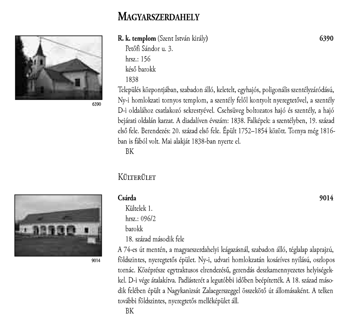Nyilvános 2454 | 7311 | Magyarszerdahely - Magyarország műemlékjegyzéke - Zala megye 2006 068-069old | A részlet szövege: MAGYARSZERDAHELY R. k. templom (Szent István király) 6390 Petőfi Sándor u. 3. hrsz.: 156 késő barokk 1838 Település központjában, szabadon álló, keletelt, egyhajós, poligonális szentélyzáródású, Ny-i homlokzati tornyos templom, a szentély felől kontyolt nyeregtetővel, a szentély D-i oldalához csatlakozó sekrestyével. Csehsüveg boltozatos hajó és szentély, a hajó bejárati oldalán karzat. A diadalíven évszám: 1838. Falképek: a szentélyben, 19. század első fele. Berendezés: 20. század első fele. Épült 1752–1854 között. Tornya még 1816ban is fából volt. Mai alakját 1838-ban nyerte el. BK KÜLTERÜLET Csárda Kültelek 1. hrsz.: 096/2 barokk 18. század második fele 9014 A 74-es út mentén, a magyarszerdahelyi leágazásnál, szabadon álló, téglalap alaprajzú, földszintes, nyeregtetős épület. Ny-i, udvari homlokzatán kosáríves nyílású, oszlopos tornác. Középrésze egytraktusos elrendezésű, gerendás deszkamennyezetes helyiségekkel. D-i vége átalakítva. Padlásterét a legutóbbi időben beépítették. A 18. század második felében épült a Nagykanizsát Zalaegerszeggel összekötő út állomásaként. A telken további földszintes, nyeregtetős melléképület áll. BK A részlet a következő könyv online változatából származik: Cím: Magyarország műemlékjegyzéke Közreműködő: Haris Andrea. (szerk.) ; Kulturális Örökségvédelmi Hivatal (Budapest) (közread.) ; Somorjay Sélysette. (szerk.) ; Bardoly István (közrem.) Szerz. közl.: [sorozatszerk. Haris Andrea, Somorjay Sélysette] ; [mtárs Bardoly István] ; [közread. a] Kulturális Örökségvédelmi Hivatal. Kiadás: Budapest : KÖH, 2006 Kötetadat: Zala megye ISBN: 963-86510-7-5 ö ISBN: 963 7474 10 2 Nyelv: magyar A jegyzék a Kultúrális Örökségvédelmi Hivatal honlapján, a következő link alatt található: http://www.koh.hu/index.php?_mp=nyitolap&_amp=MUEML A fejléc adatairól 1. Objektum neve – törzsszám A fejléc első sora a műemlék eredeti rendeltetésének megfelelő nevet tartalmazza. Mögötte zárójelben templom esetében annak titulusa, más épületeknél indokolt esetben az eredeti rendeltetéstől eltérő, mai használatra utaló intézmény név (pl. városháza, múzeum, szálloda, oktatási intézmény hivatalos neve, stb.) olvasható. A törzsszám (trsz.) a műemlék egyetlen soha nem változó adata. A gyors azonosítás, illetve a törzsszám szerinti keresés lehetősége végett az objektummal egy sorban, a fejléc jobb szélén kiemelten jelenik meg. Összetartozó műemlék részek vagy történetileg egy együttest alkotó műemlékek sokszor külön törzsszámon lettek műemlékké nyilvánítva. Előfordulhat ezért, hogy egy fejléc alatt a leíró részben több, külön törzsszámmal rendelkező objektum szerepel. A törzsszámot ezekben az esetekben is az objektummal egy sorban tüntetjük fel. 2. Utca, házszám Egy utcán belül, amennyiben a számozás ezt lehetővé teszi, először a templomot adjuk meg, ezt követi a parókia, majd egyéb objektumok, pl. szobrok következnek. Házszám nélkül említünk egyes műemlékfajtákat (elsősorban templomokat), amennyiben a topográfiai azonosítás szempontjából a házszám közömbös vagy éppen zavaró. Előfordul, hogy a műemlék nem köthető nevesített közterülethez. Az ilyeneket a település végéhez soroltuk, és a leírásban kitértünk a településen belül elfoglalt helyükre. 3. Helyrajzi szám Ha egy helyrajzi számon és egy címen (pl. temetőben) több, külön törzsszámmal védett objektum van, akkor az együttesre utaló műemlék megnevezés alatt a közös adatokat egyszer adjuk meg. Ezt követően külön címszavanként következik a műemlékek leírása. Ilyen esetben az emlékeket mutatóztuk. Ezt az eljárást követtük, tekintet nélkül arra, hogy a teljes együttes védett-e vagy sem. (Védett együttes mellett mindig törzsszám szerepel.) Ha több helyrajzi szám is tartozik egy törzsszámhoz, akkor a fejlécben valamennyi számot feltüntettük. Amennyiben ilyen esetben több elemből álló műemlékről van szó, akkor a leíró részben minden külön említett elem után zárójelben megadjuk a vonatkozó helyrajzi számot. 4. Stílus A műemléket jelenleg meghatározó, domináns stílusjegy alapján került meghatározásra. Egyéb, érzékelhető stíluselemekre a leíró részben utalunk. 5. Datálás A műemléket jelenleg leginkább jellemző építési dátum. Korábbi építési periódusokra, illetve későbbi átépítésekre a történeti részben utalunk, fennmaradt részletek esetén lehetőség szerint azokra vonatkoztatva. A leírás A műemlékek leírása tartalmilag öt szakaszból áll, amely folyamatos szövegként jelenik meg. Az objektum topográfiai meghatározása a műemlék településen belüli vagy ahhoz viszonyított helyét adja meg, amennyiben ez az azonosításhoz nélkülözhetetlen, avagy azt segíti. Az emlék jellegének leírása utal a környezettel való kapcsolatra (tájolás, beépítés módja, környező terepviszonyok, amennyiben ezek jellemzőek), alaprajzi elrendezésre, tömegre és a jellegzetes homlokzati elemekre (pl. rizalitok, erkélyek, stb.). Részletes homlokzatleírás nem volt cél. Belső építészeti részletet csak akkor említünk meg, ha ez tartozékként jelentős, esetleg a datálás vagy a stílus meghatározás alapjául szolgált. Ezt követi az épület tartozékainak és berendezésének utalásszerű ismertetése (falfestés, üvegablak, berendezés), az adott elem után zárójelben az ismert mesterek nevével; az orgonát külön említjük, amennyiben hangszerként is műemléki értékkel bír. A mesternevekre, berendezésre történő utalás jelzésszerű, tételes információért 