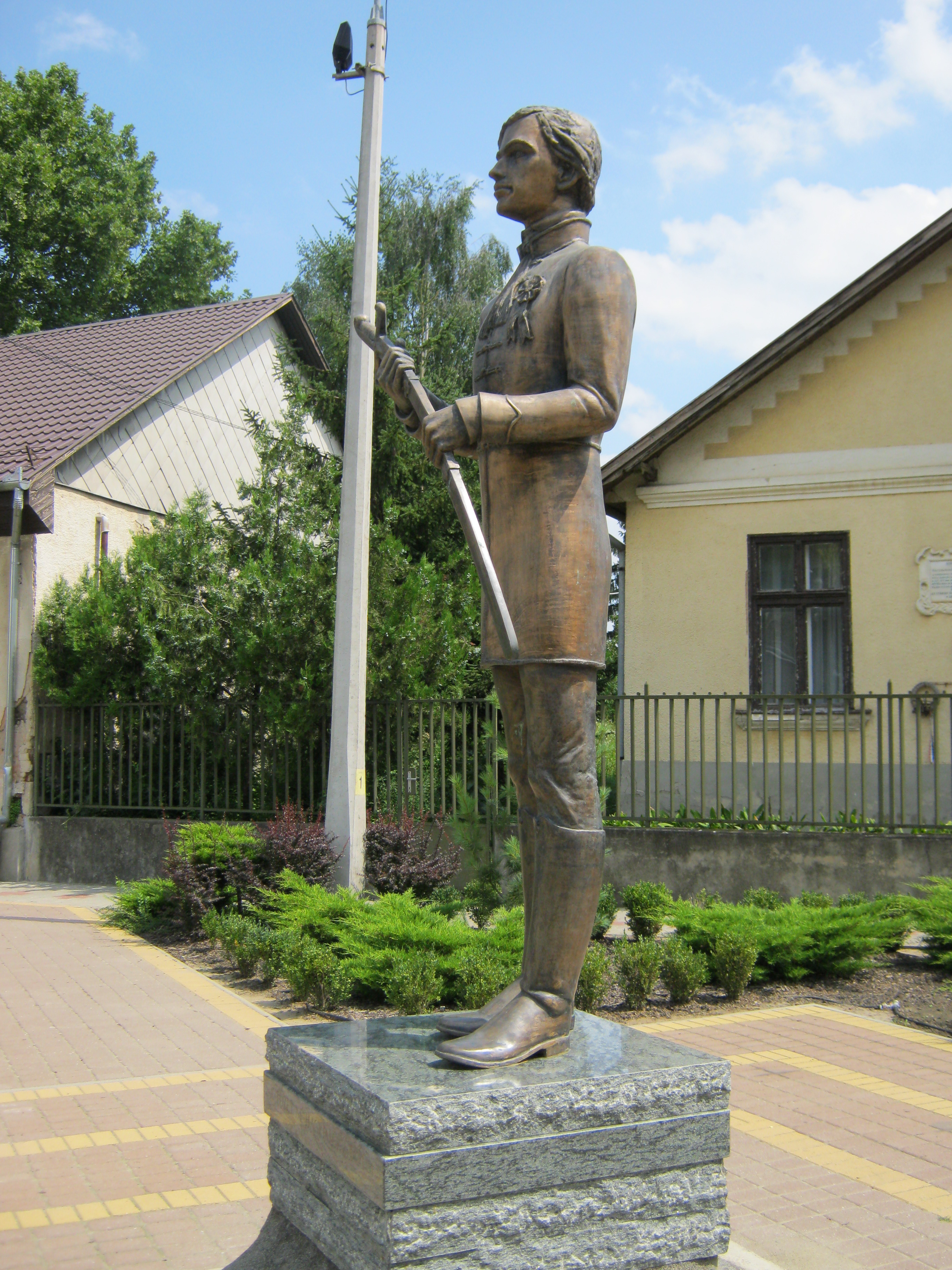 Nyilvános 1042 | 1612 | Nagykálló, Szabadság tér 6. előtt: Márciusi Ifjú szobra | Korányi Frigyes szülőháza előtt állították fel 2006-ban Nagy Lajos Imre: Márciusi ifjú című egészalakos szobrát annak emlékére, hogy 1848. szeptember 11-én 1200 ifjú önkéntes tett esküt Nagykálló főterén. A szobor Korányi szülőháza előtt állva emlékeztet arra is, hogy Korányi Frigyes maga is részt vett a szabadságharcban. Felh. irod.: Harsányi Gézáné: Kálló kincsei. Nagykálló, 2007 A fénykép 2010 augusztus elején készült |