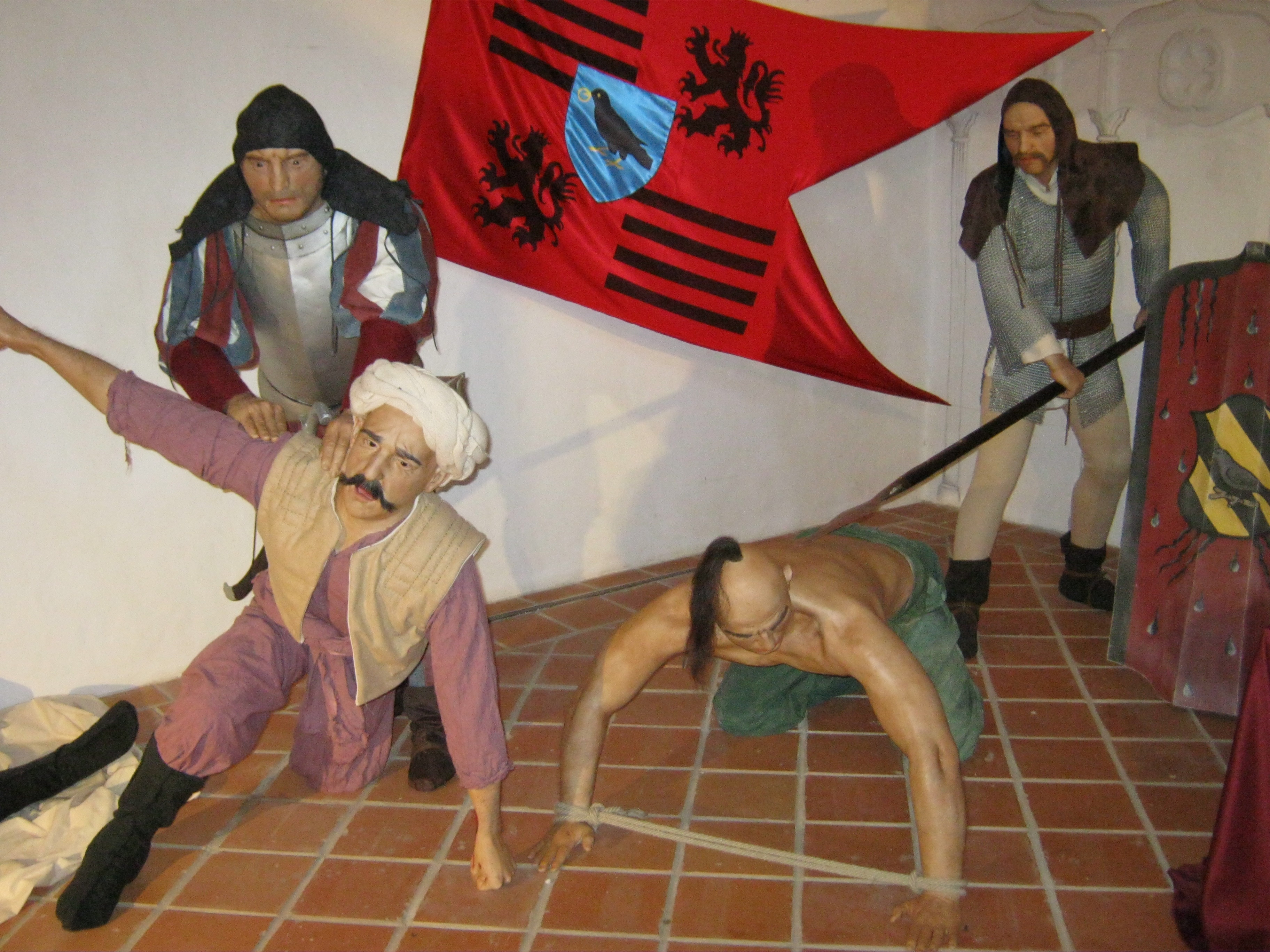 Nyilvános 1041 | 1419 | Nyírbátor, Vár utca 1. Báthori várkastély | A Báthoriak várkastélyának többször átalakított egyetlen megmaradt épületét a közelmúltban állították helyre. Pincéjében reneszánsz étterem látogatható, földszintjén és emeletén a Báthori Panoptikum 45 élethű és korhű viaszfigurában mutatja be érzékletesen a jeles nemesi család és Nyírbátor történetét. A figurák tervezője és készítője Megyeri János szobrászművész. A megtekintést olvasható és hallgatható kalauzolás kíséri. A kiállítást a kenyérmezei csata 530. évfordulóján, 2009.október 13-án adták át. Az 1479-ben a törökkel vívott csata egyik hőse Báthori István volt. A képen a kenyérmezei csata egy jelenete látható. Felh. irod.: Látnivalók Szabolcs-Szatmár-Bereg megyében. Miskolc, Well-PRess, 1999 www.bathorivarkastely.hu A fénykép 2010 augusztus elején készült. |